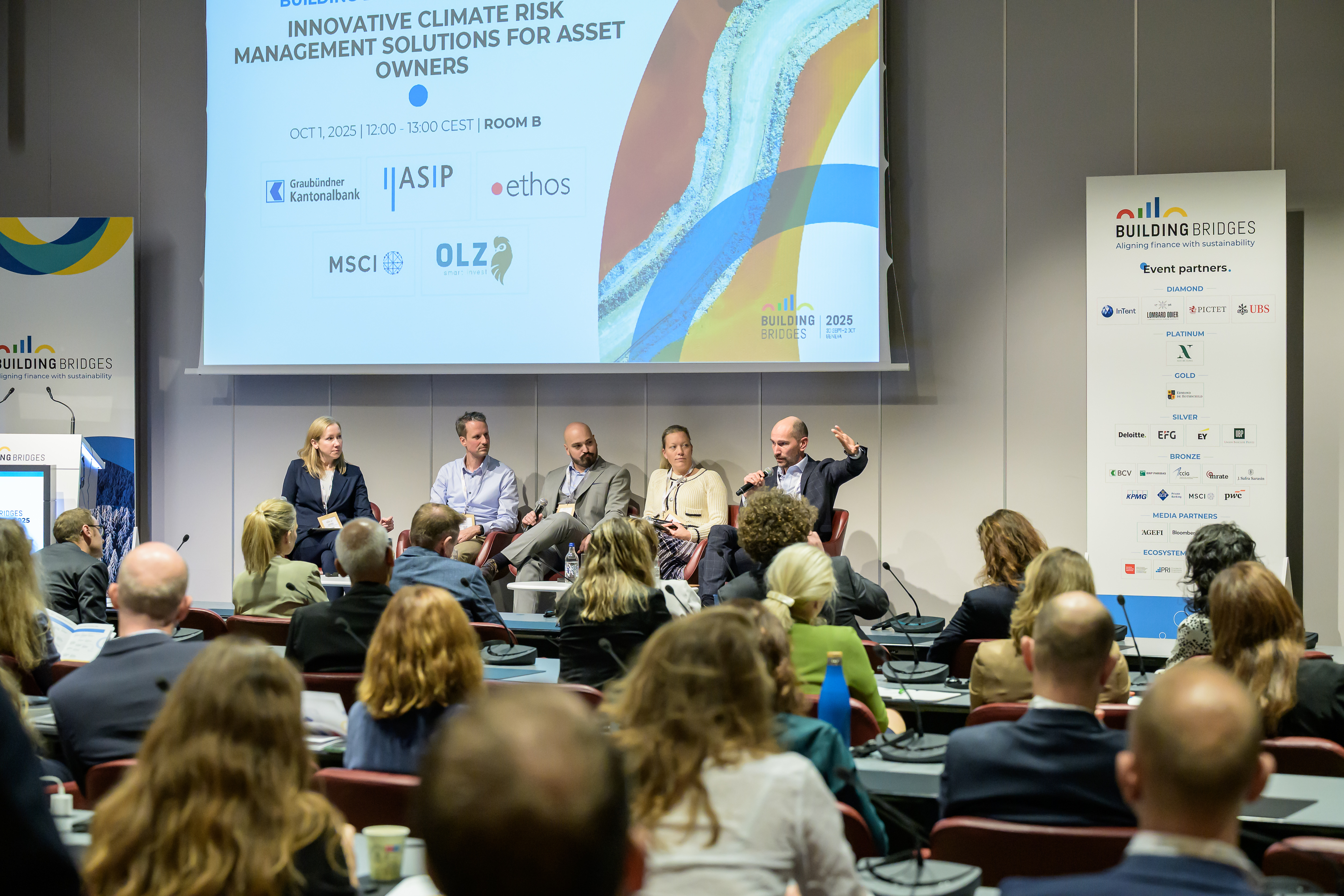 Alexandra Pastollnigg, Head Responsible Investing GKB, diskutiert mit Daniel Lüchinger (CIO GKB und Mitglied des Pensionskassen-Anlageausschuss), Antonello Cirulli (OLZ AG), Lisa Eichler (MSCI) und Vincent Kaufmann (Ethos Stiftung). Foto: Building Bridges 2025 / Francois Wavre, Lundi13