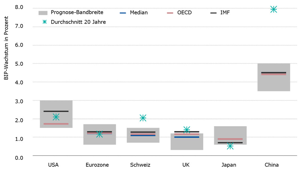 Für China wird mittelfristig ein robustes Wachstum von 4.5 bis 4.8 Prozent erwartet. In diesem «New Normal»-Zustand ist das Ziel von 5 Prozent ausser Reichweite. Die anhaltende Schwäche im Immobiliensektor sowie die hohe Staats- und Unternehmensverschuldung bremsen das Wachstum. Trotz deflationärer Tendenzen und einer schwachen Inlandnachfrage hält die chinesische Zentralbank die Leitzinsen stabil.