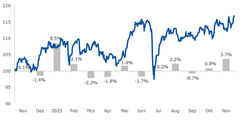 Der Schweizer Aktienmarkt bietet weiterhin hohe Qualität zu einem vernünftigen Preis: Viele Unternehmen weisen eine starke Marktstellung mit Preissetzungsmacht auf und sind zudem attraktiv bewertet. Im letzten Monat ist das Index-Schwergewicht Roche mit einer guten Wertentwicklung aufgefallen. Die Stimmung im Gesundheitssektor hat sich seit Anfang Oktober deutlich aufgehellt. Zudem hat Roche ein Erfolg in einer medizinischen Studie zusätzlichen Rückenwind verliehen.