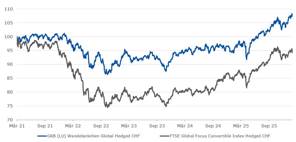 Der GKB Wandelanleihen Global Fonds (Anteilsklasse G, in CHF) gewann 2.60% an Wert und war damit deutlich besser als der Vergleichsindex. Auf Einzeltitelebene lieferten die folgenden Aktien die beste Performance: MKS, Energy Fuels, AST Spacemobile, Zhen Ding, WisdomTree und Bilibili. Am schwächsten entwickelten sich dagegen Commvault Systems, Rubrik, Guidewire Software, MakyMyTrip und Nutanix.