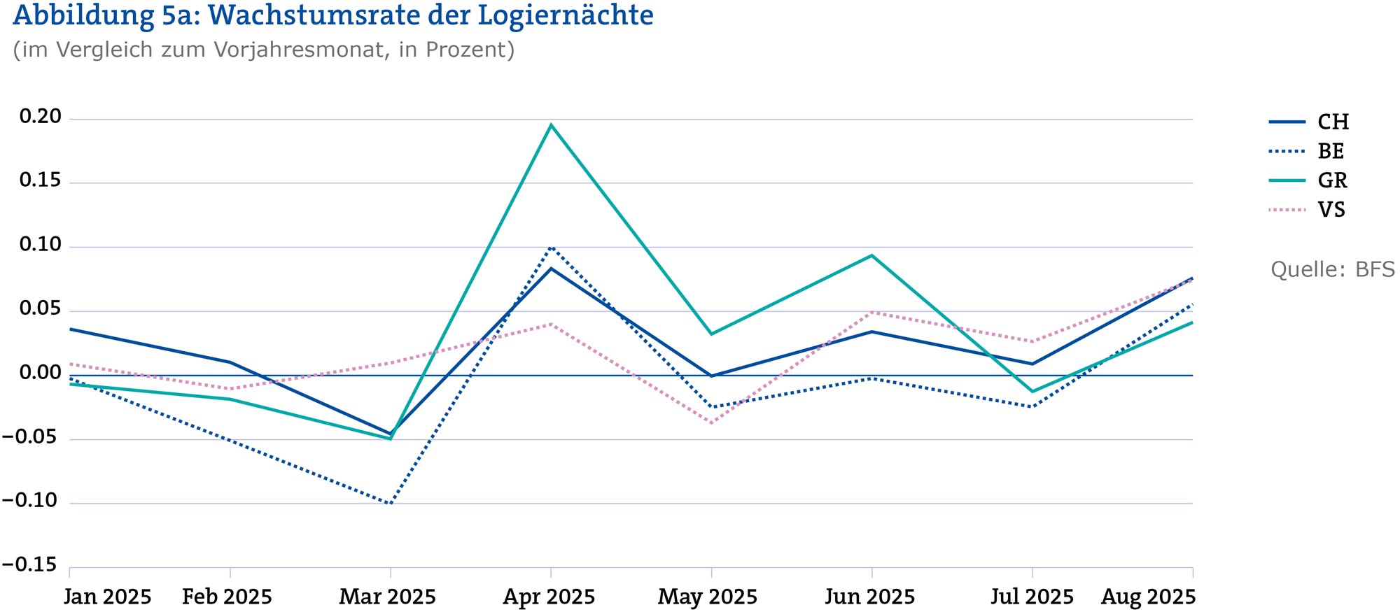 Nach einem verhaltenen Start im ersten Quartal liegen die kalendertagbereinigten Logiernächtezahlen seit April – mit Ausnahme des Julis – über den Werten der entsprechenden Vorjahresmonate. Der August erreichte den höchsten Wert seit 2022, übertroffen nur vom pandemiebedingt aussergewöhnlichen Jahr 2021.