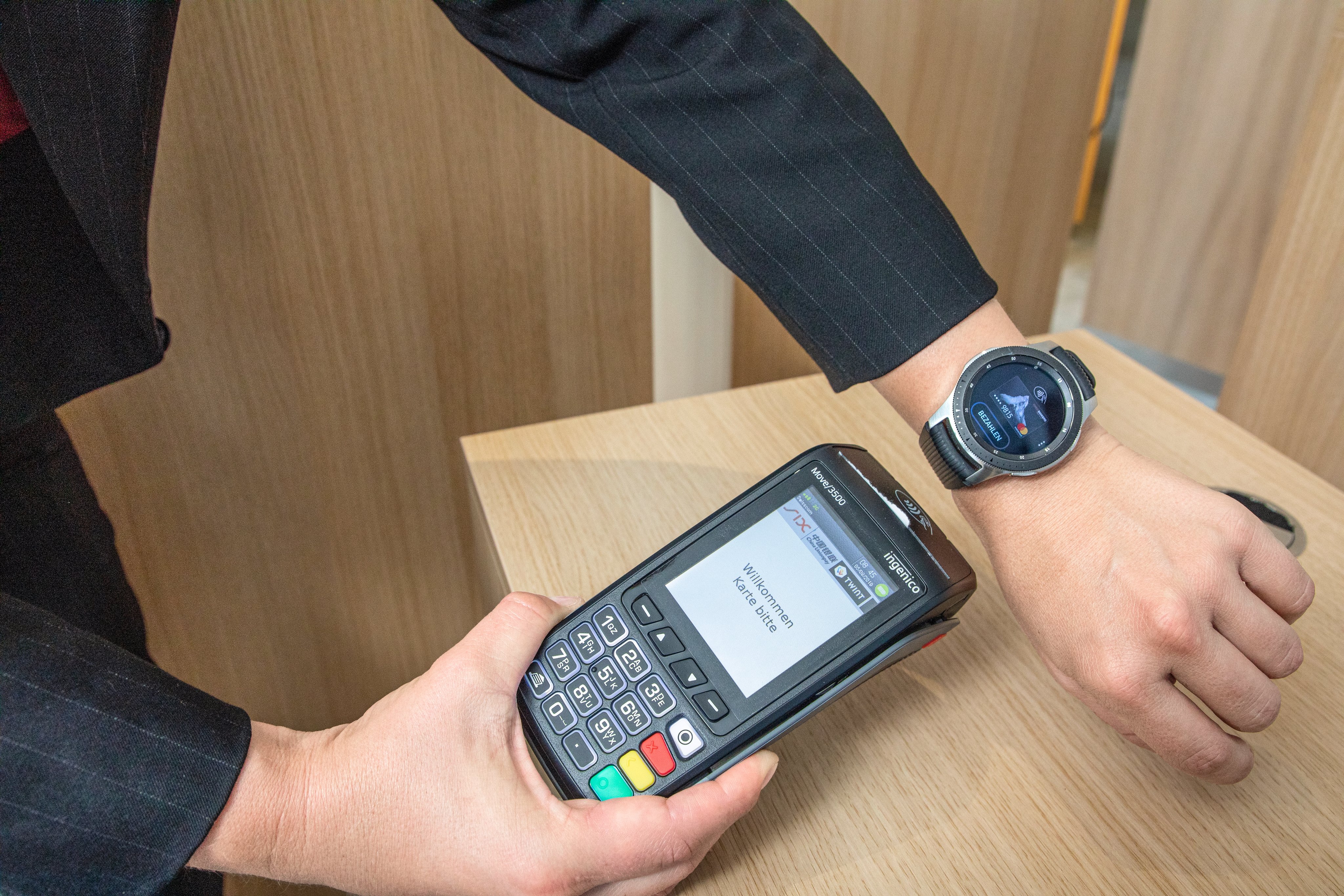Halten Sie den Knopf an Ihrer Smartwatch für einige Sekunden gedrückt. Klicken Sie auf das Kartensymbol und geben Sie den Gerätecode ein. Halten Sie die Smartwatch über den Zahlterminal.
