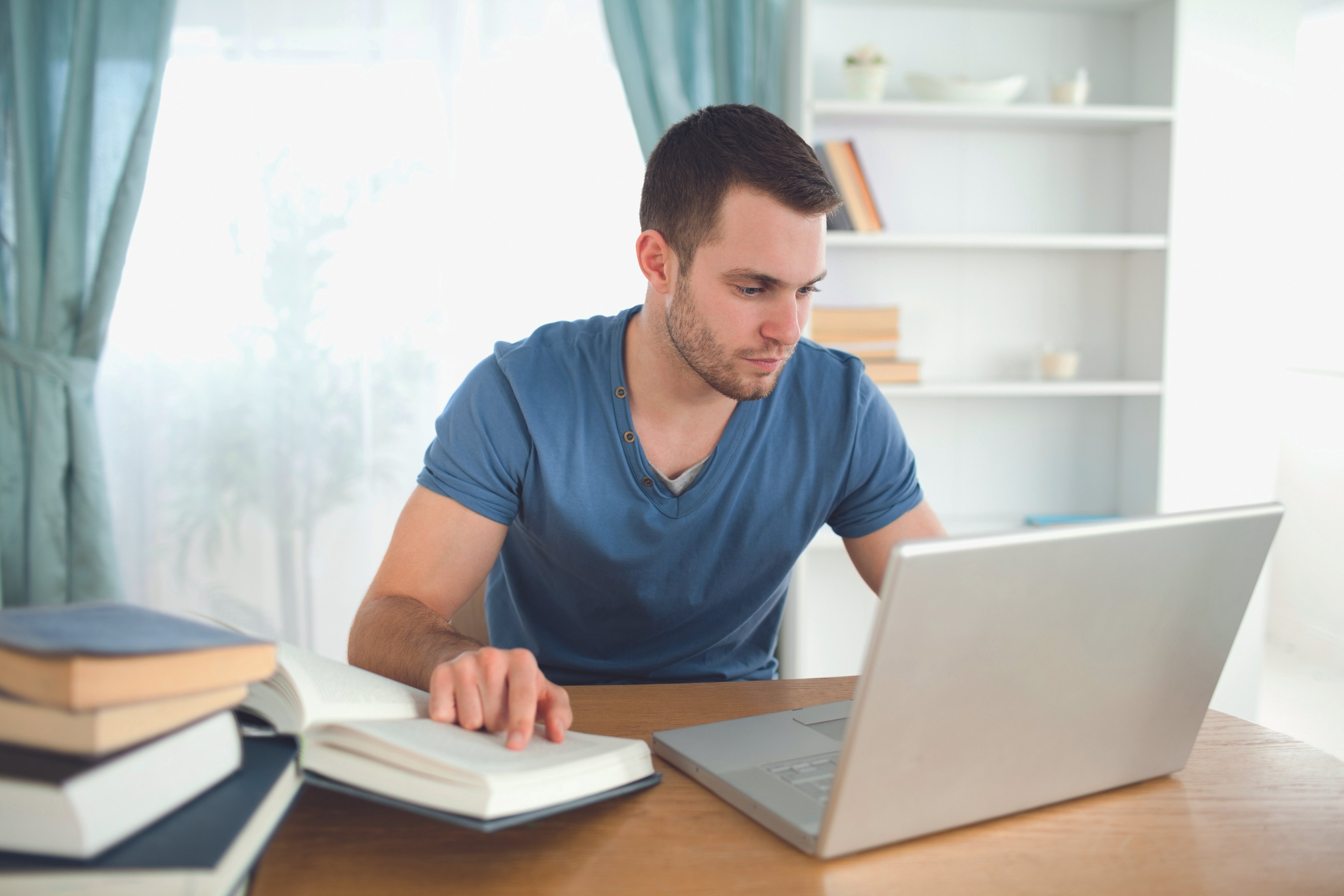 Junger Mann sitz am Computer mit einem Buch.