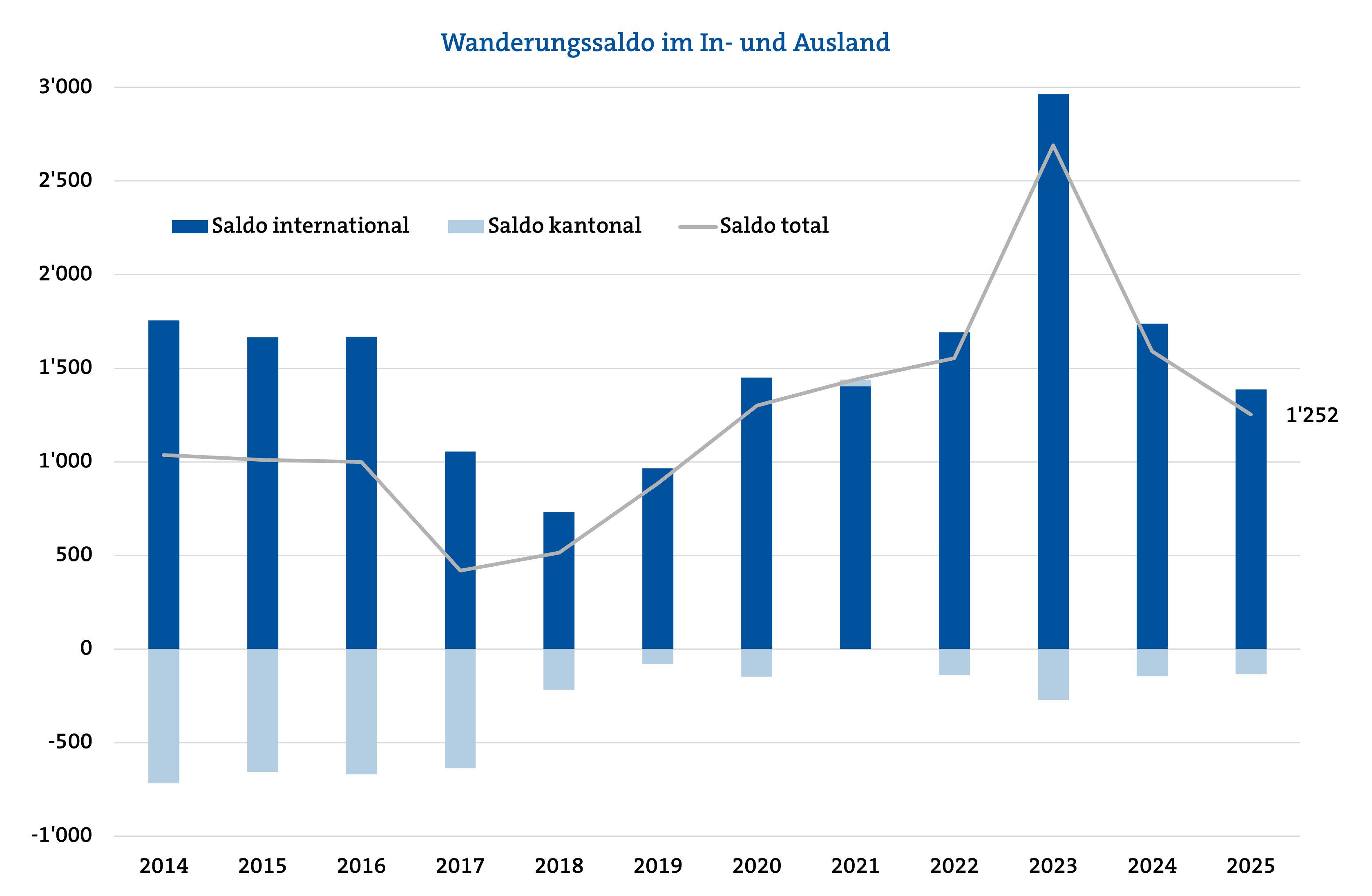 Demgegenüber hat die Zuwanderung aus dem Ausland zwischen 2018 und 2023 deutlich zugenommen und den negativen kantonalen Saldo teilweise kompensiert. Inzwischen zeigt sich jedoch eine Normalisierung: Die internationale Zuwanderung hat sich abgeschwächt. Für das laufende Jahr wird ein gesamtpositiver Wanderungssaldo von rund 1’250 Personen erwartet. Das ist ein Zeichen für stabile, aber weniger dynamische Bevölkerungsbewegungen.