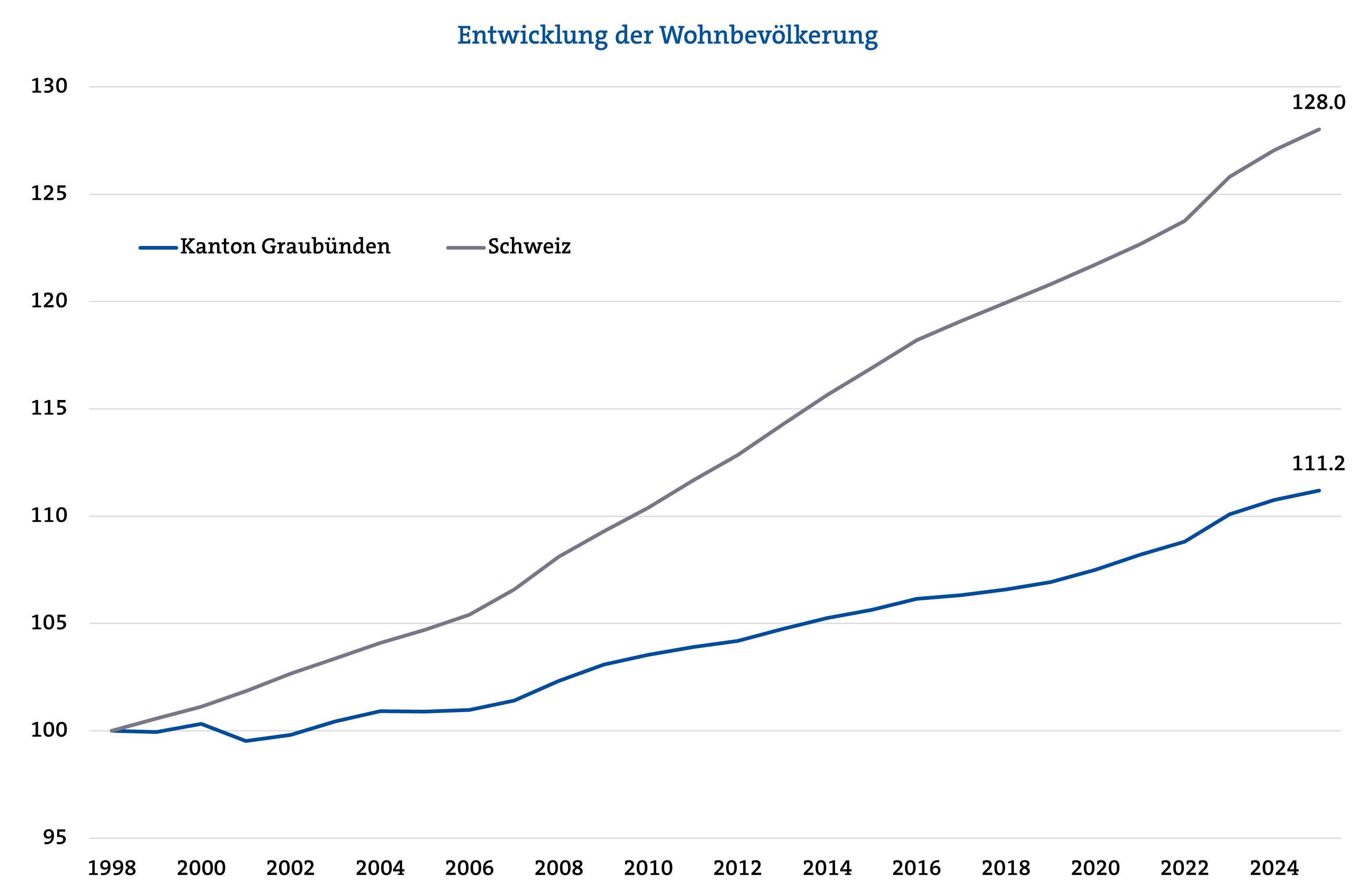Die Wohnbevölkerung im Kanton Graubünden dürfte im Jahr 2025 um rund 0.4% zunehmen – etwas weniger stark als in den beiden Vorjahren. Zum Vergleich: Schweizweit liegt das Bevölkerungswachstum bei +0.8%.