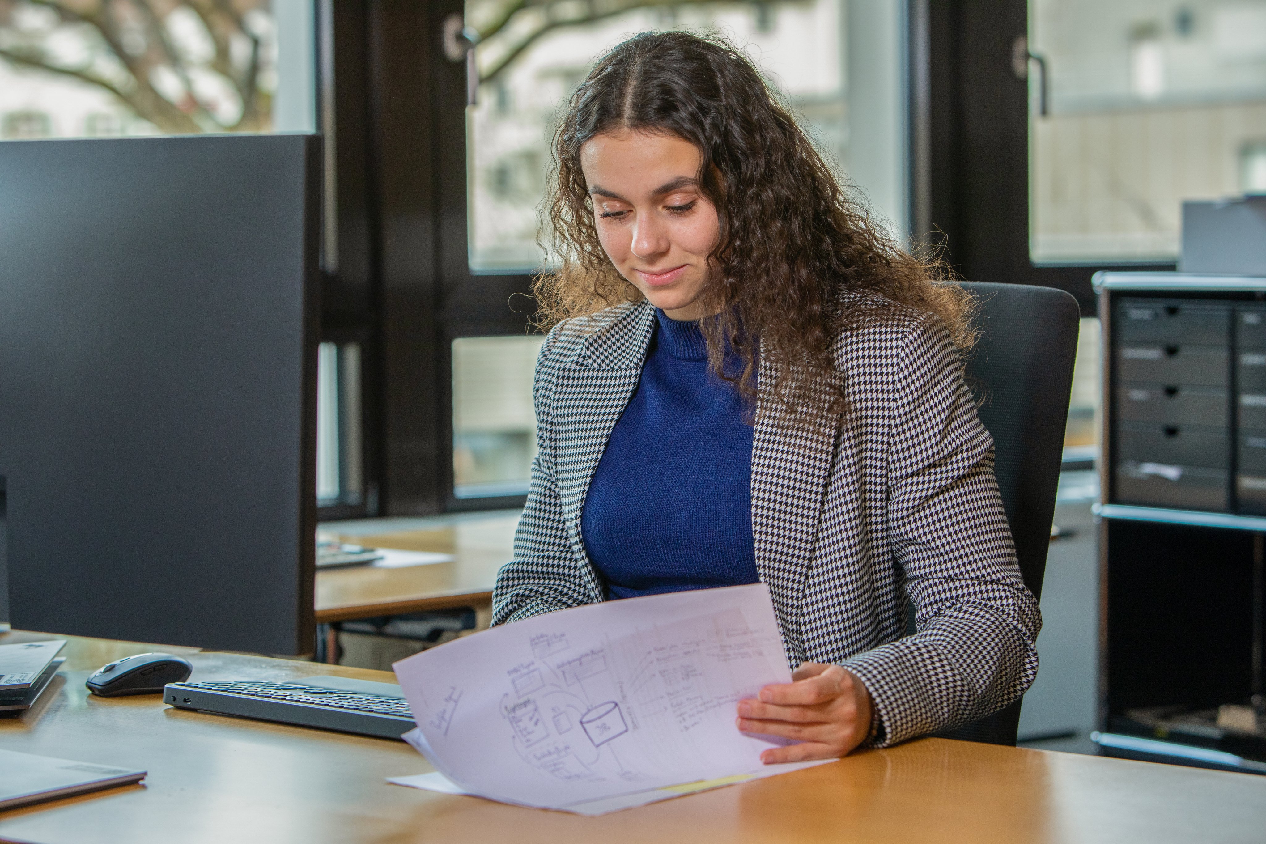 Lernende befindet sich an ihrem Arbeitsplatz. Sie schaut sich Notizen und Dokumente an und wertet diese aus.