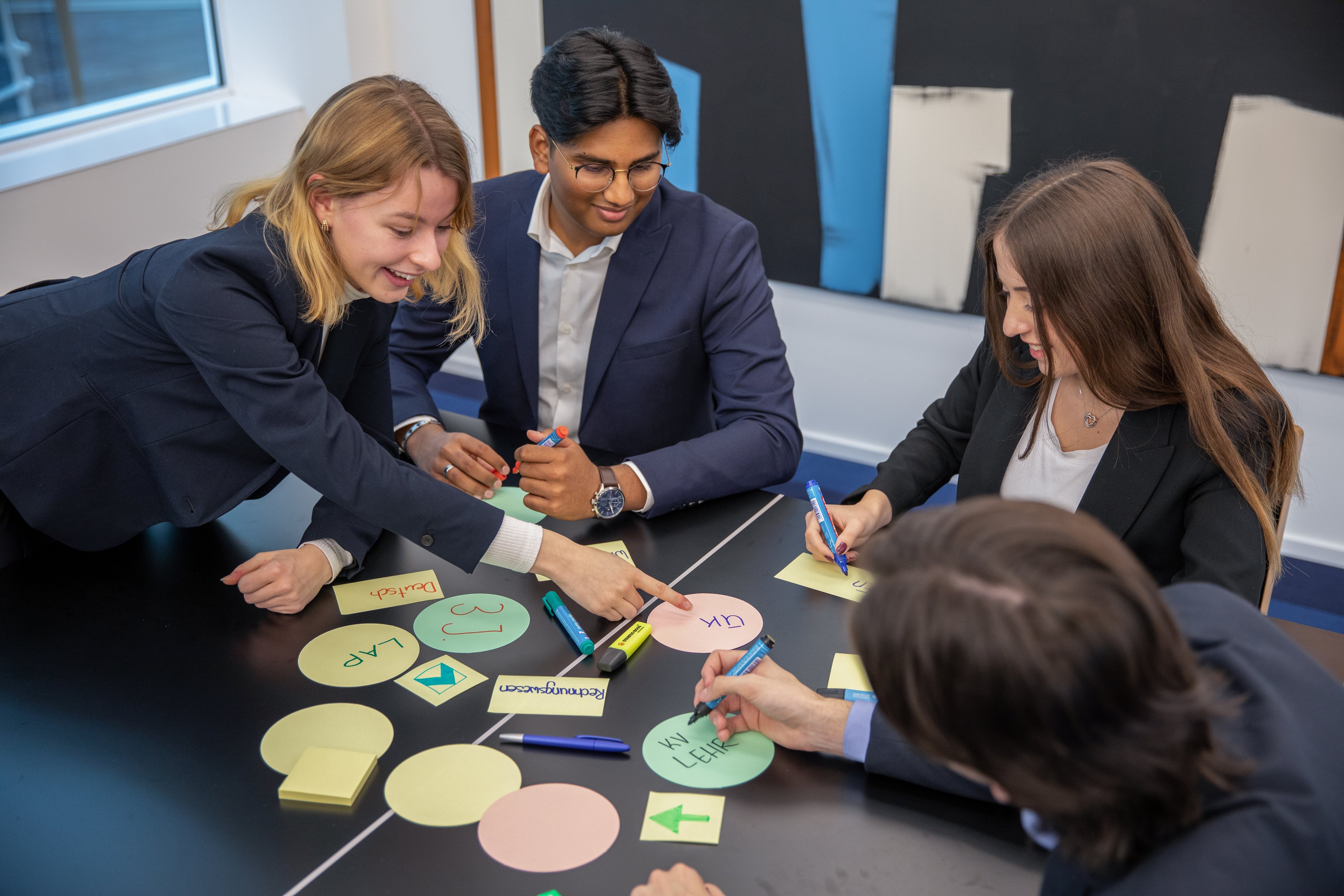 Lernende am Brainstormen auf einem Tisch mit Post-its.