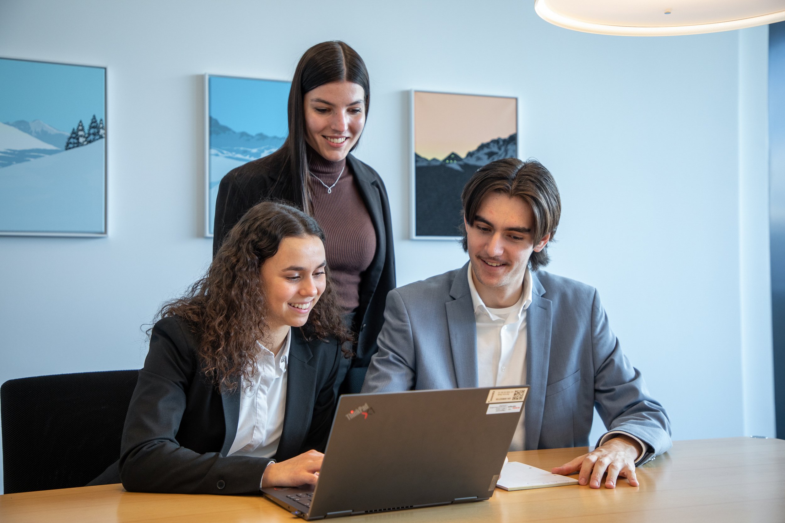 Lernende haben eine Sitzung in einem Sitzungszimmer in Flims. Alle schauen auf den Laptop. Zwei Lernende sitzen und eine Lernende steht hinter ihnen.