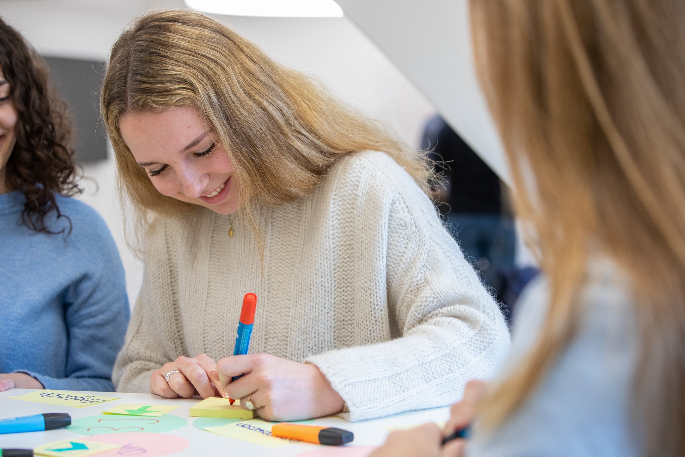 Lernende haben eine Besprechung oder einen Workshop. Lernende schreibt mit einem Stift eine Notiz.