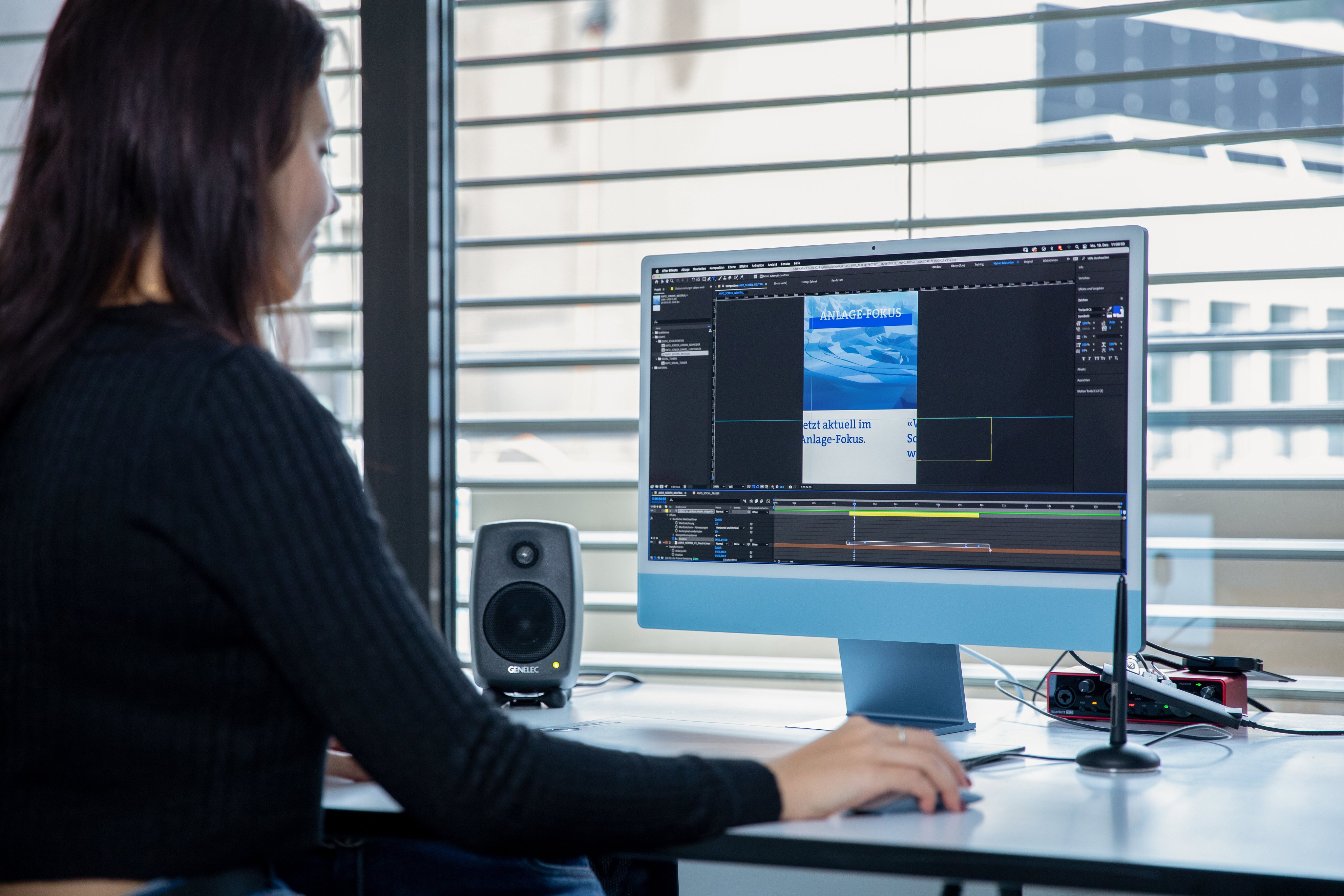 Lernende Mediamatikerin sitzt beim Schnittplatz vor dem Bildschirm und erstellt eine Animation oder schneidet ein Video.