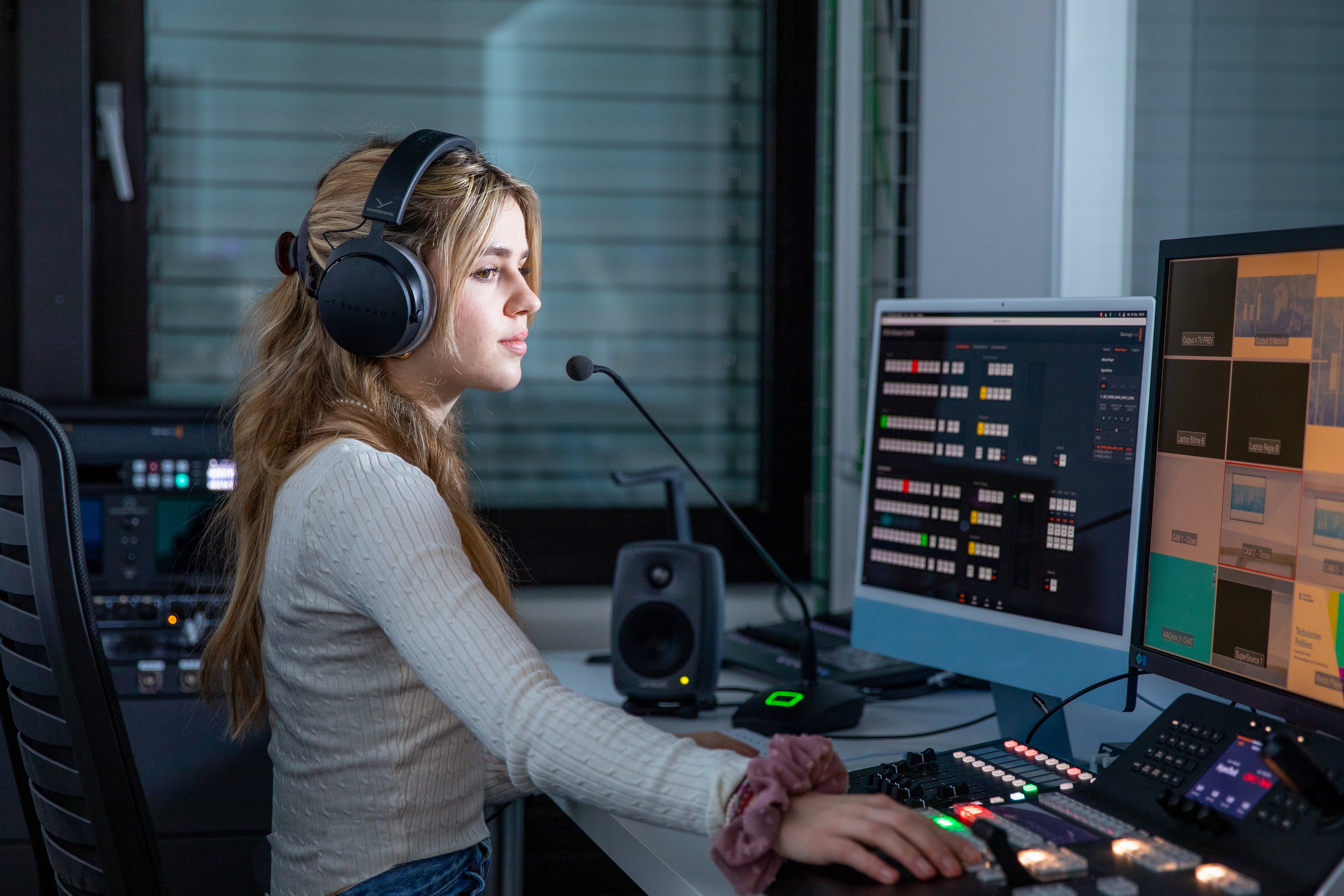 Lernende Mediamatikerin arbeitet am Bildschirm im Studio. Sitzt an einem Tisch und trägt Kopfhörer.