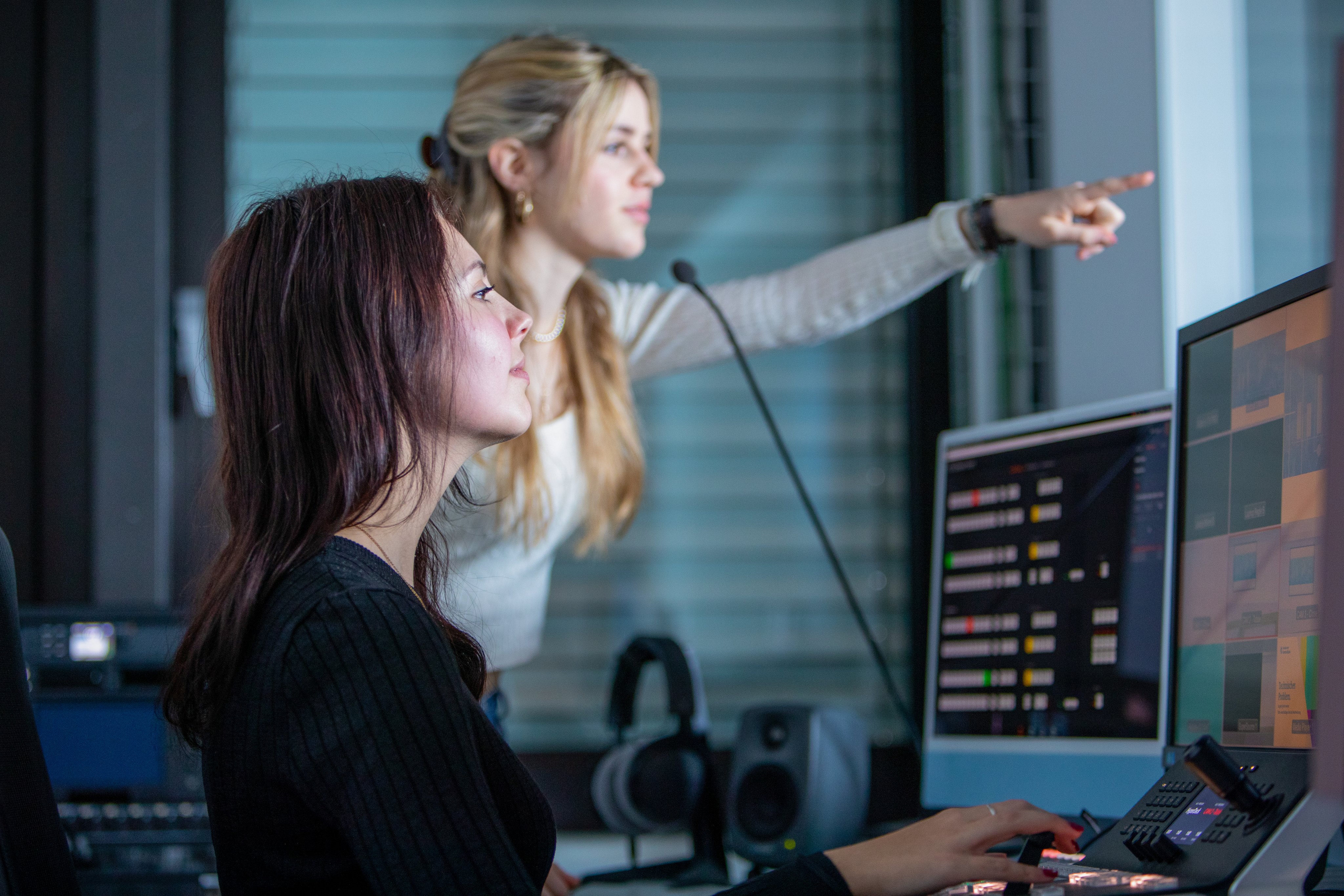 Lernende Mediamatikerinnen befinden sich in der Regie des Studios. Sie Besprechen Inhalte von Videoaufnahmen.