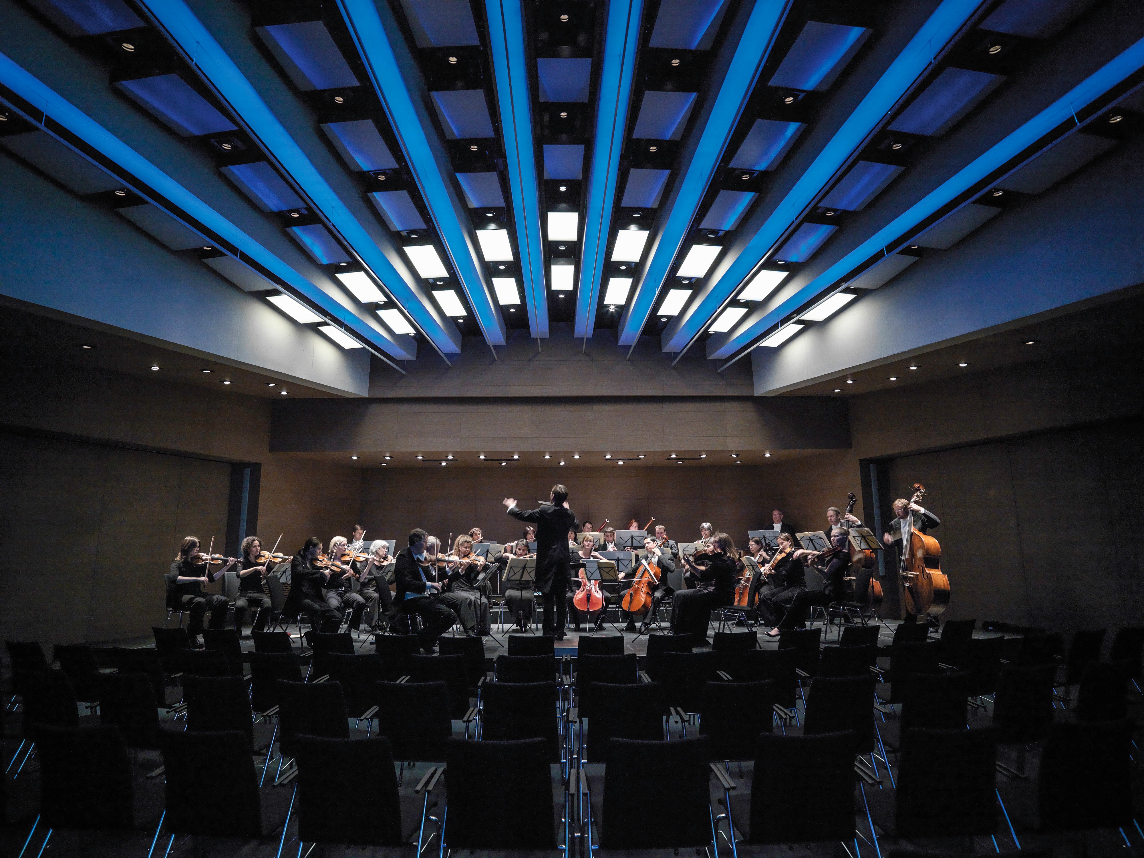 Die Kammerphilharmonie spielt ein Konzert im Auditorium. Der Dirigent sowie die Spieler sind da. Verschiedene Streichinstrumente werden gespielt.