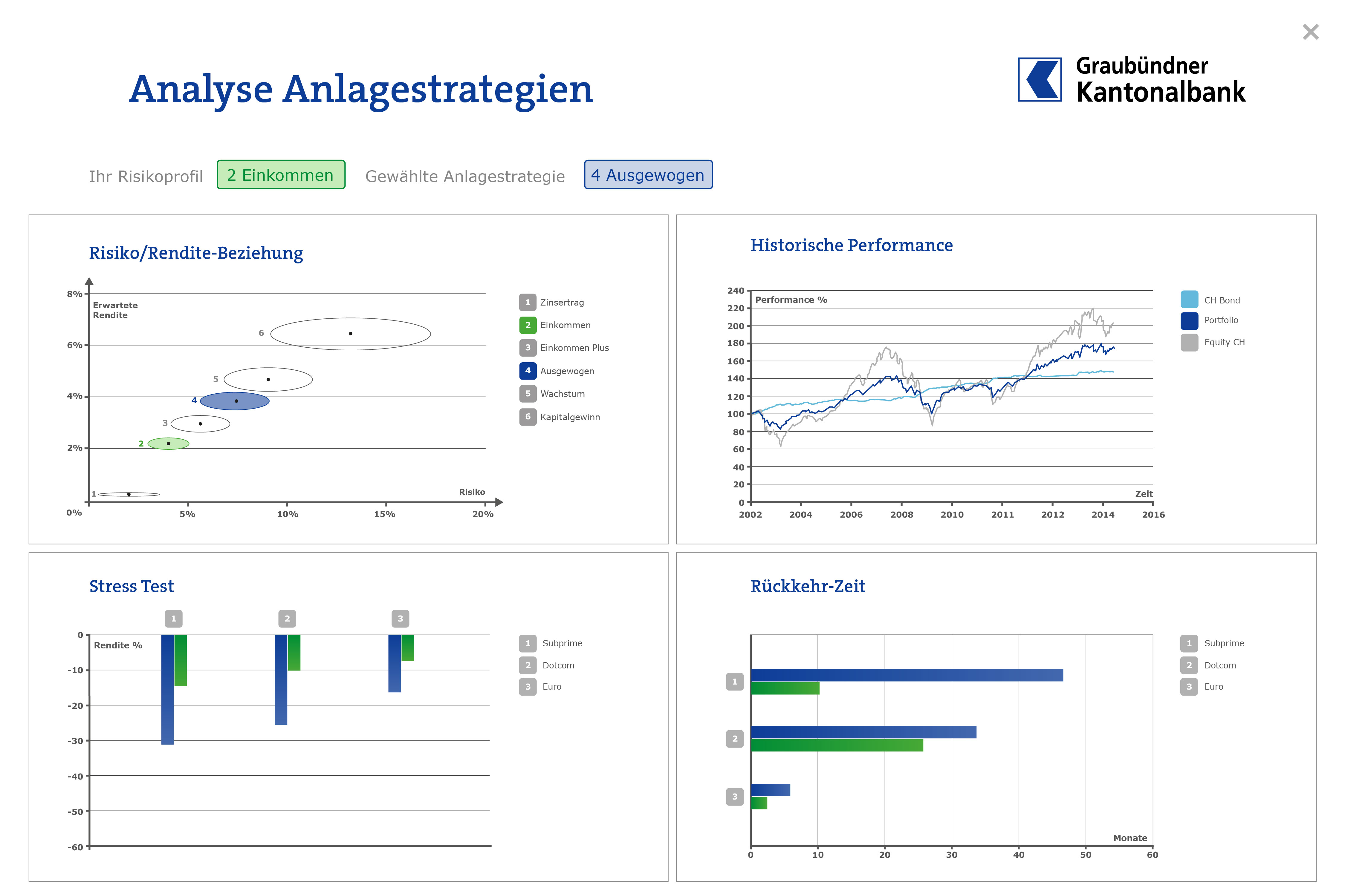 Anlageerfolg hängt zu einem grossen Teil von der richtigen Anlagestrategie ab. Entsprechend wichtig ist eine massgeschneiderte Lösung, die optimal auf die Erreichung der jeweiligen Anlageziele ausgerichtet ist. Die neue digitale Anlageberatung der Graubündner Kantonalbank begegnet der wachsenden Komplexität im Anlagegeschäft mit einer innovativen, softwareunterstützten Beratung, unterlegt mit dem gesamten Wissen ihres Investment Centers. «Damit macht die GKB ihre Anlagekompetenz im Kundengespräch anschaulich und verständlich erlebbar, so dass Anlegerinnen und Anleger auf die Herausforderungen moderner Finanzmärkte vorbereitet sind. Technik ist wichtig, Schlüsselkompetenz bleibt die persönliche Beratungsleistung», bestätigt GKB CEO Alois Vinzens.