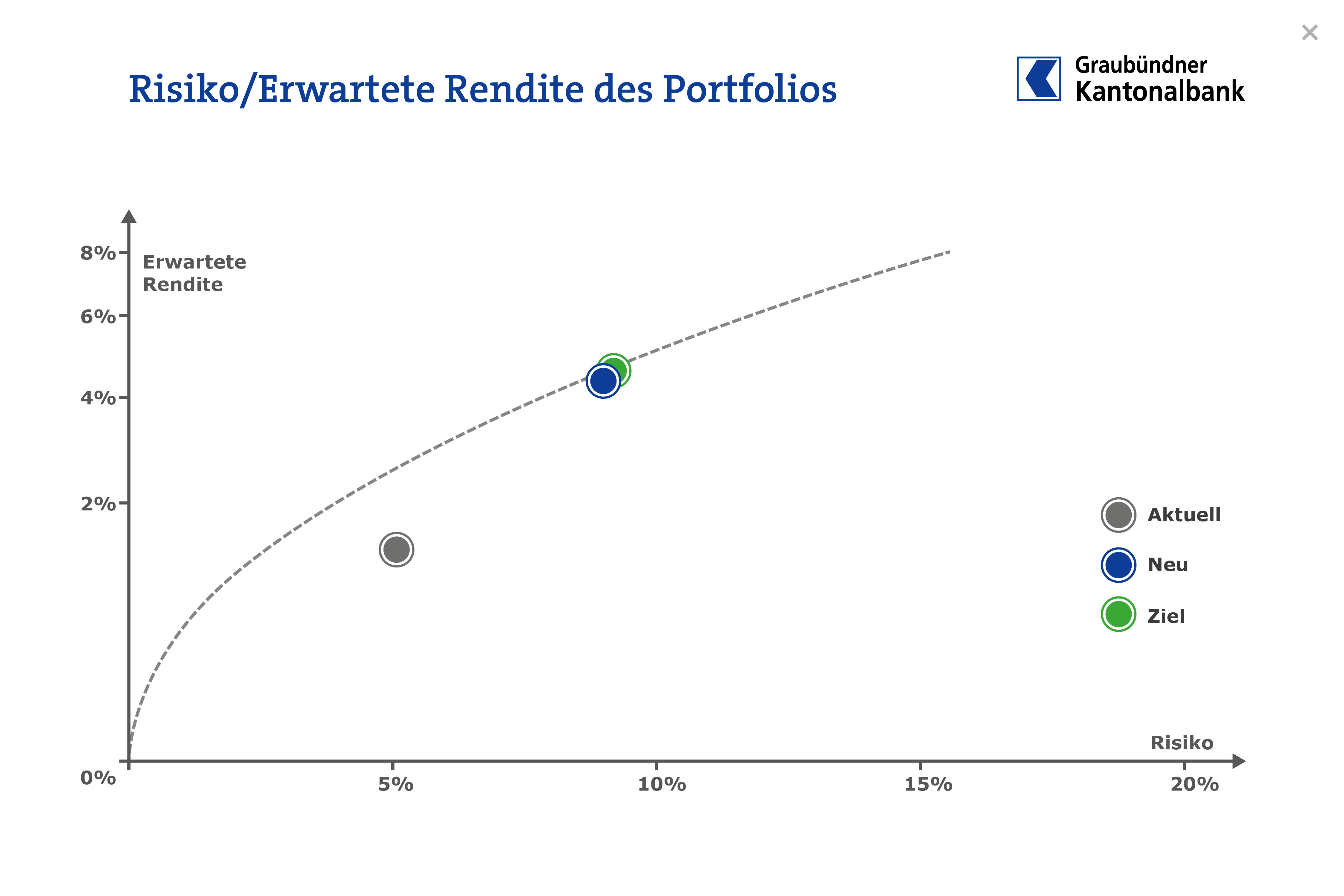 Während Technik und Systemunterstützung das Anlegen in vielerlei Hinsicht verständlicher, einfacher und – mit Blick auf regulatorische Anforderungen – auch sicherer machen, bleibt die Schlüsselkompetenz die Beratungsleistung selbst. Dabei setzt die Graubündner Kantonalbank auf Kontinuität und Individualität. Mit der neuen digitalen Anlageberatung bietet sie optimale Voraussetzungen dafür, indem sie innovative Technologie als Beratungs-, Anlageempfehlungs- und Monitoring-Unterstützung einsetzt. Ein zentraler Vorteil für Kundinnen und Kunden ist, dass sich die Anlagen einfach visualisieren und in Echtzeit darstellen lassen.