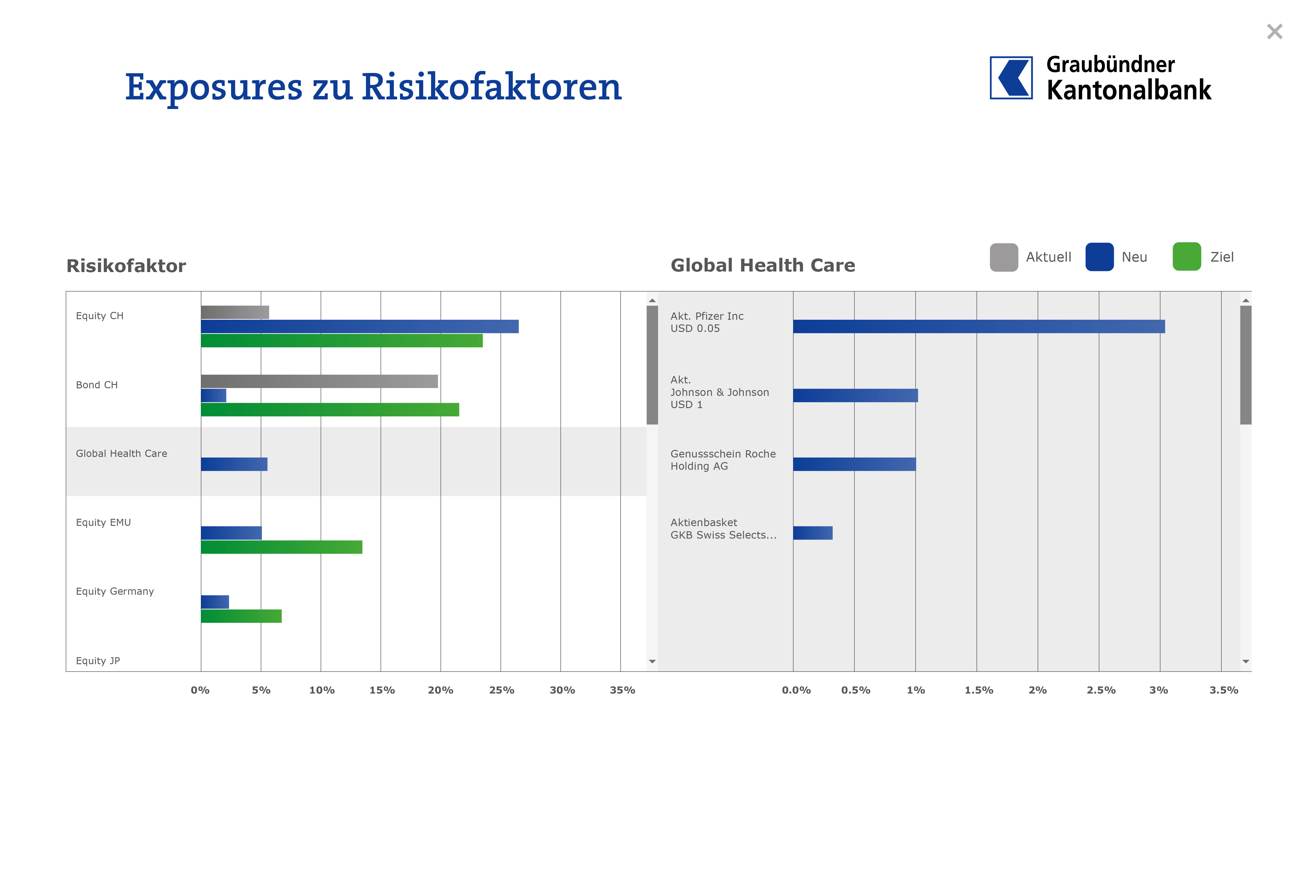 Ab sofort ist die tabletgestützte Beratung mit moderner Visualisierung ein wichtiger Bestandteil im Kundengespräch. Die Entwicklung von Vermögenswerten und wählbare Anlagestrategien werden in Echtzeit dargestellt und simuliert. Anhand der historischen Performance wird ersichtlich, wie sich das Portfolio mit der entsprechenden Strategie in der Vergangenheit entwickelt hätte. Für künftige Investitionen simulieren Kunde und Berater auf dem Tablet gemeinsam die Erfolgsaussichten verschiedener Anlagestrategien, damit das Portfolio bewusst und weitsichtig festgelegt werden kann. Die Visualisierung hilft, das Anlageoptimum anhand der persönlichen Renditeziele und Risikobereitschaft zu bestimmen und das aktuelle Depot daran anzugleichen. Beim neuen GKB Beratungs-Mandat können Anleger ihre Präferenzen auswählen und beispielsweise bestimmte Branchen, Titel oder Währungen individuell festlegen.