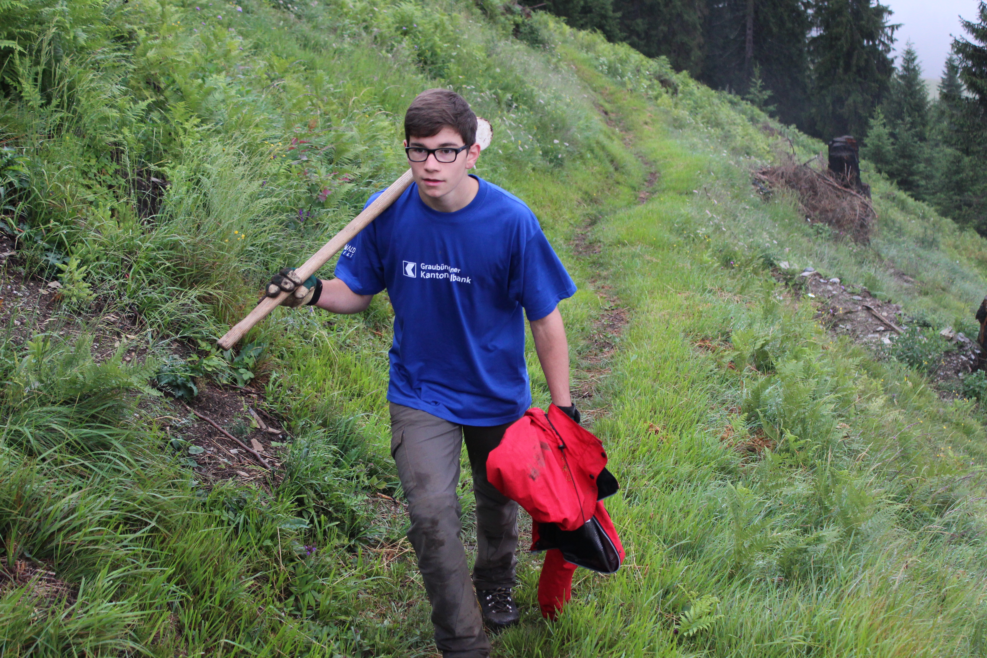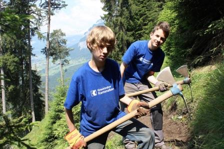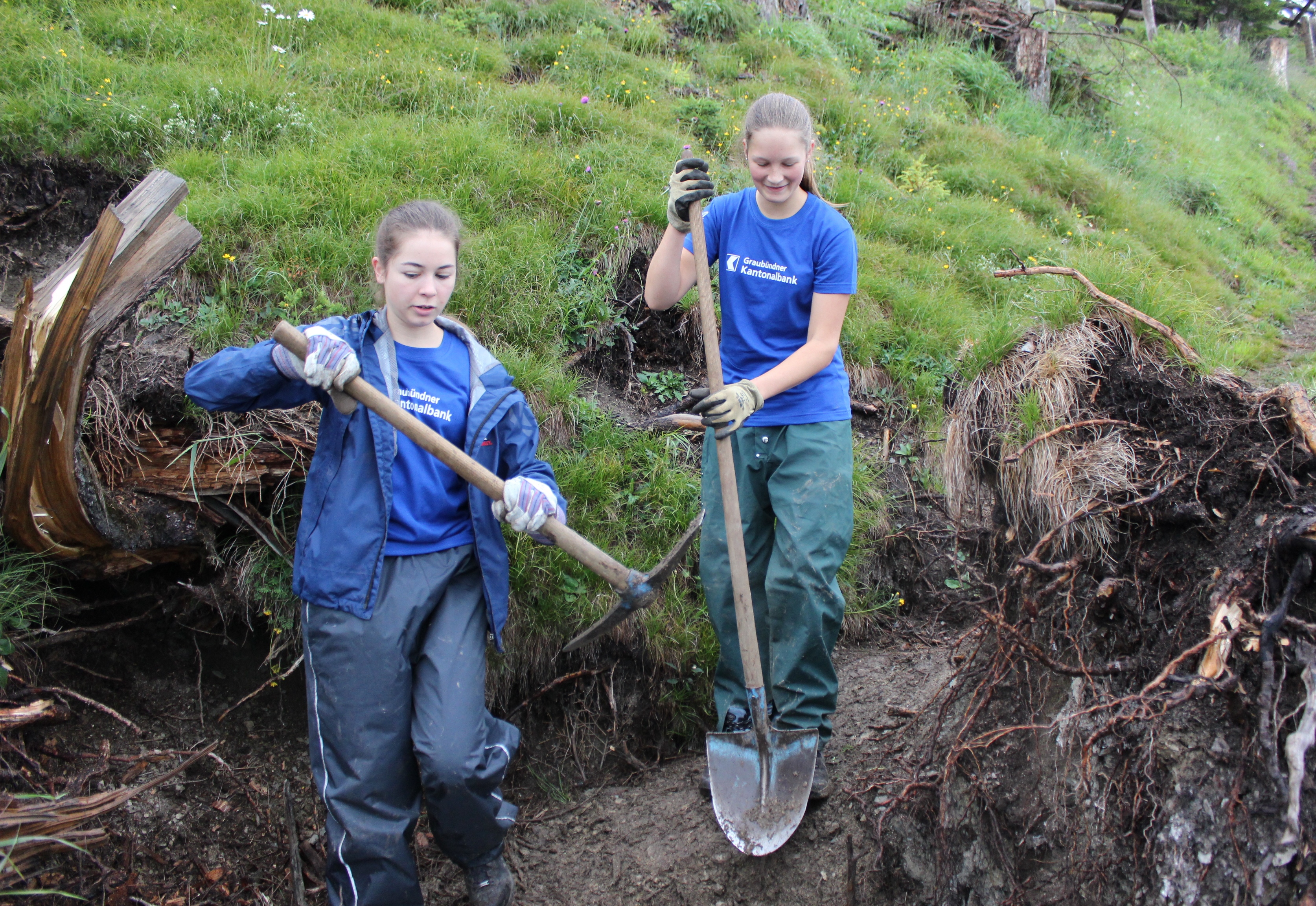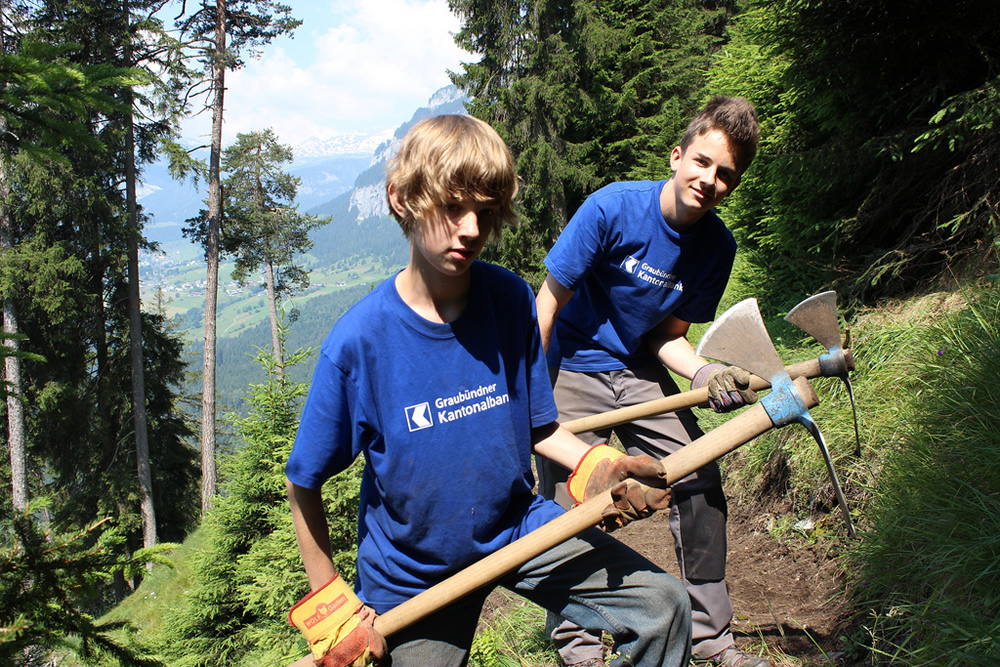 Das GKB Bergwaldprojekt stiess letztes Jahr auf grosse Nachfrage. Für die 60 Plätze sind über 200 Bewerbungen eingegangen. Im Sommer 2015 findet das Projekt zum dritten Mal statt, dieses Mal an den Standorten Chur, Cazis, Laax und Klosters. Während einer Woche tragen die ausgewählten Teilnehmerinnen und Teilnehmer mit den Förstern des Bergwaldprojekts aktiv zum Erhalt der vielfältigen Schutzfunktion des Bergwaldes bei. Unter anderem werden Begehungswege gebaut, Zäune gegen Wildverbiss aufgestellt oder Bäumchen gepflanzt. Für ihren einwöchigen Einsatz erhalten die jungen Arbeiterinnen und Arbeiter 500 Franken.