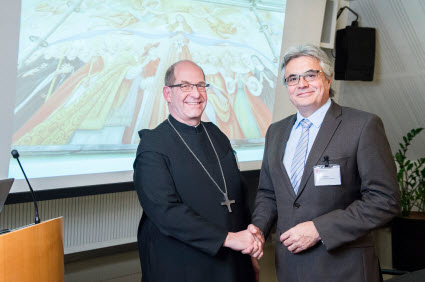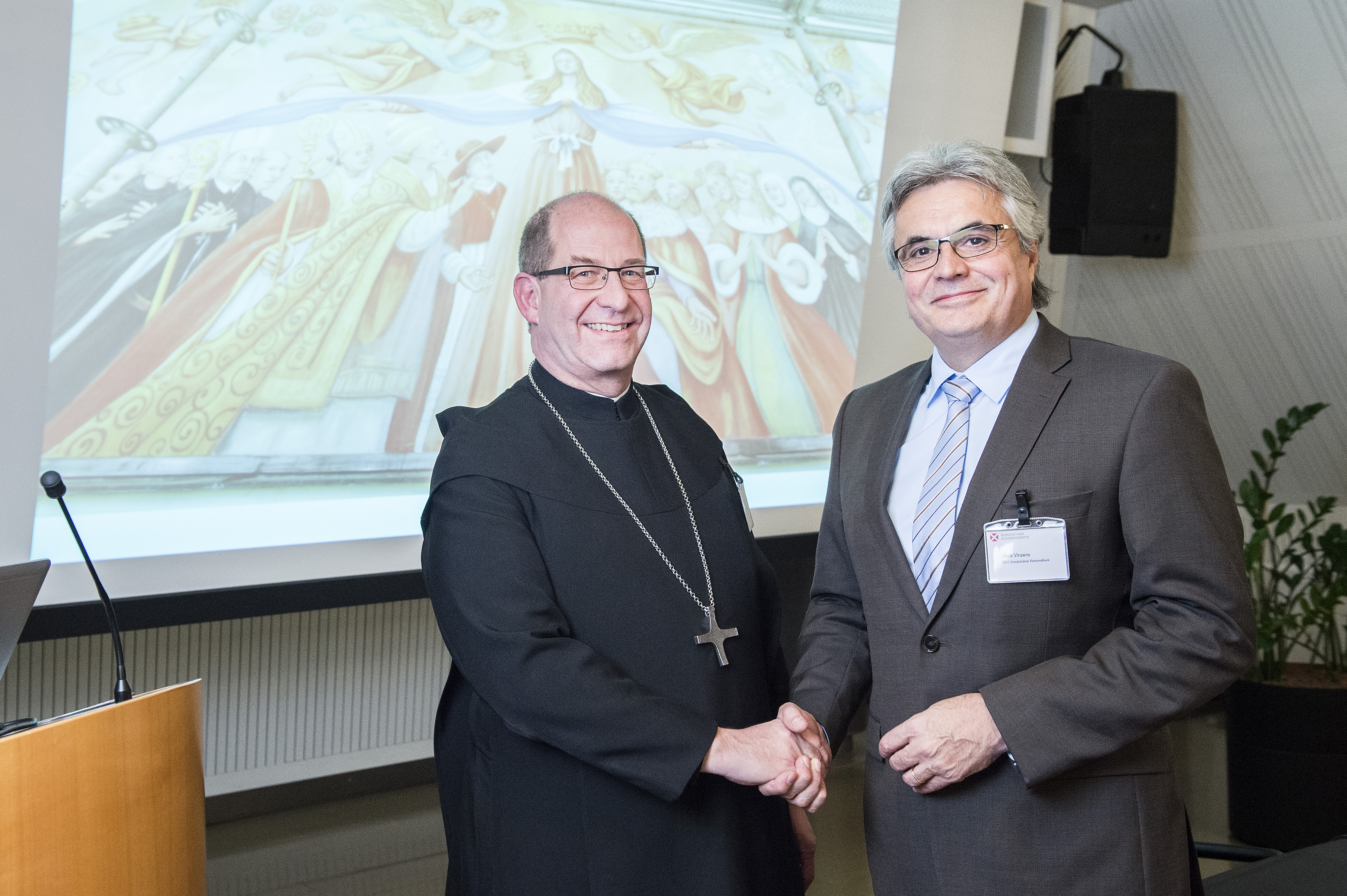 GKB unterstützt Restaurierung der Südfassade der Klosterkirche Disentis. Im Bild Abt Vigeli Monn und GKB CEO Alois Vinzens.