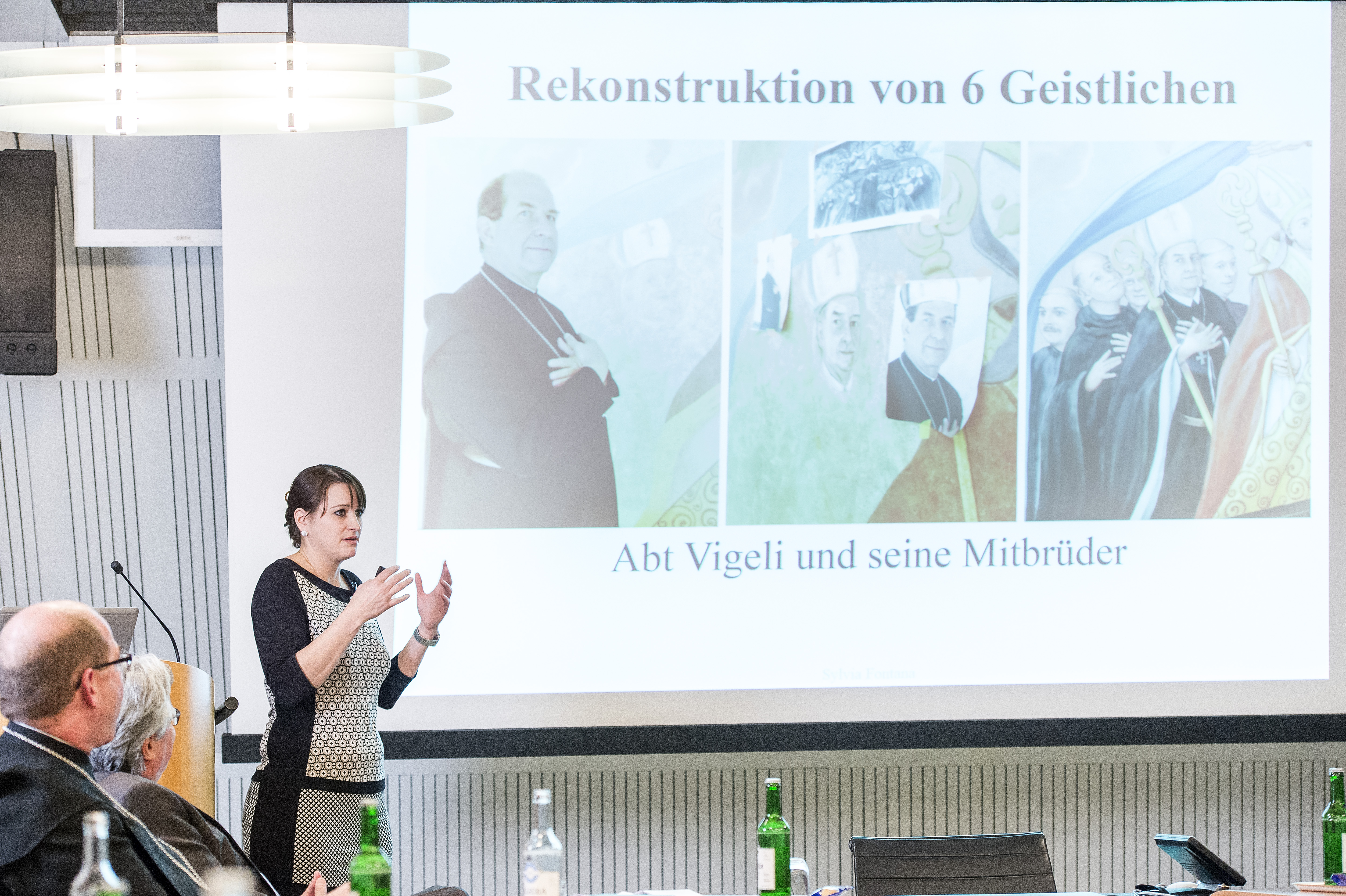 Im Laufe der Restaurierungsarbeiten entschieden die Restauratoren, unterstützt durch die Denkmalpfleger des Kantons und des Bundes, das Bild der Schutzmantelmadonna dort zu restaurieren, wo noch genügend Details sichtbar waren und dort zu rekonstruieren, wo „Leerstellen“ auftraten. So seien z. B. die Gesichter des Abtes und sechs weiterer Geistlicher nicht mehr erkennbar gewesen. „Unsere Lösung für die Leerstellen war, Abt Vigeli und sechs seiner Mitbrüder für die Neu-Zeichnung der Gesichter zu porträtieren“, erläutert Sylvia Fontana das Vorgehen der Rekonstruktion des Bildes. Heute repräsentieren nun Abt Vigeli, Bruder Gerhard, Bruder Fridolin, Abt em. Daniel und Bruder Thierry den Geistlichen Stand im neuen Schutzmantelbild.