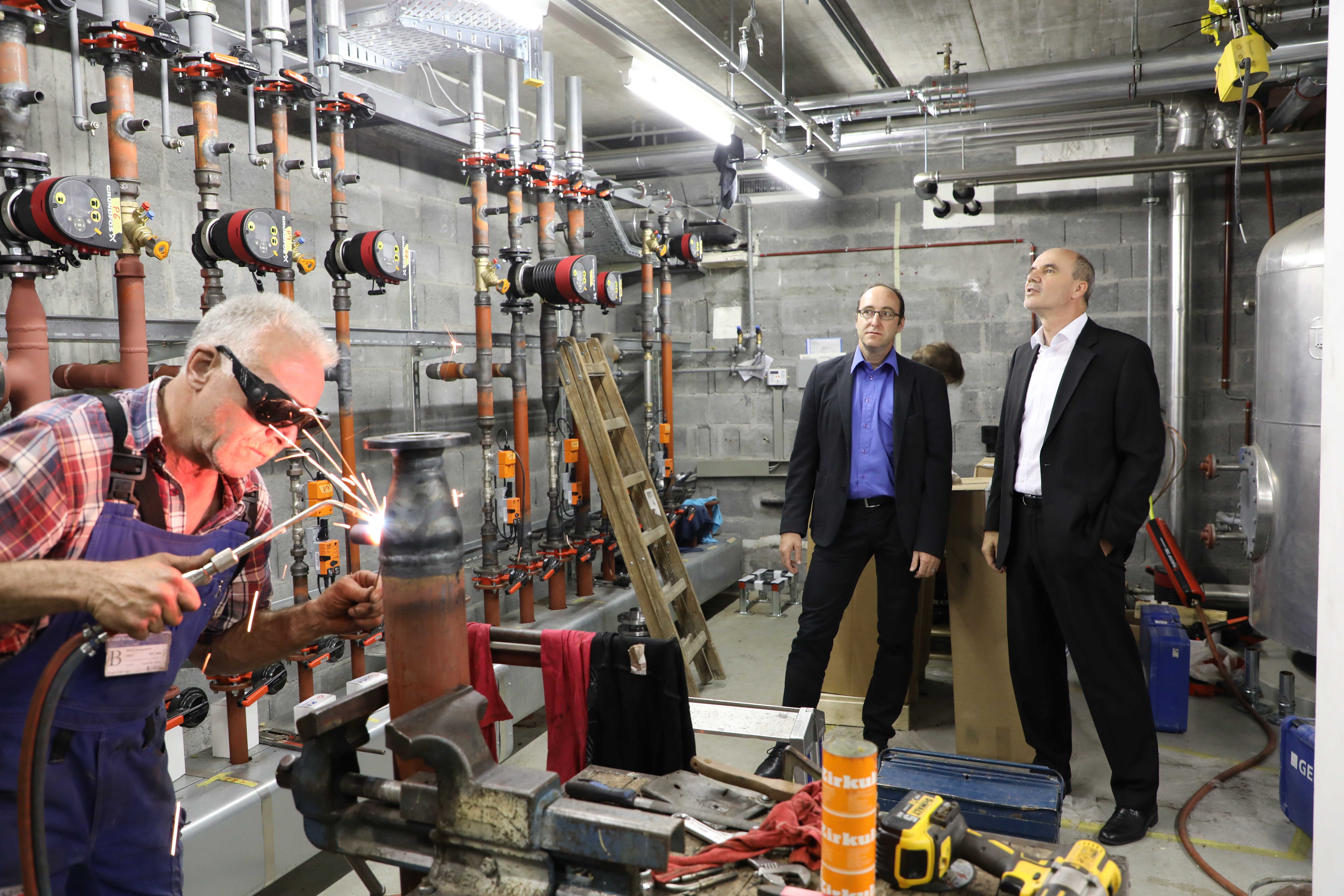 Letzte Arbeiten am neuen Heizsystem: v.r. Leiter Infrastruktur Thomas Fischli und Marco Tomaschett, Leiter Wartung und Unterhalt, nehmen einen Augenschein.