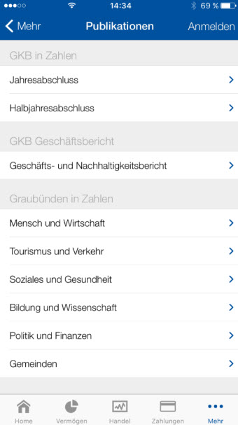 Zusätzlich wurde die Startseite der App komplett überarbeitet und übersichtlicher gestaltet. Die wichtigsten Funktionen lassen sich jetzt nach individuellen Bedürfnissen anordnen und schneller aufrufen. Als weiteren Service in die GKB Mobile Banking App integriert sind verschiedene Publikationen zum Kanton Graubünden und zur GKB. Dazu gehören die Statistikbroschüre «Graubünden in Zahlen», der GKB Geschäftsbericht sowie die Flyer zu den Jahres- und Halbjahreszahlen.