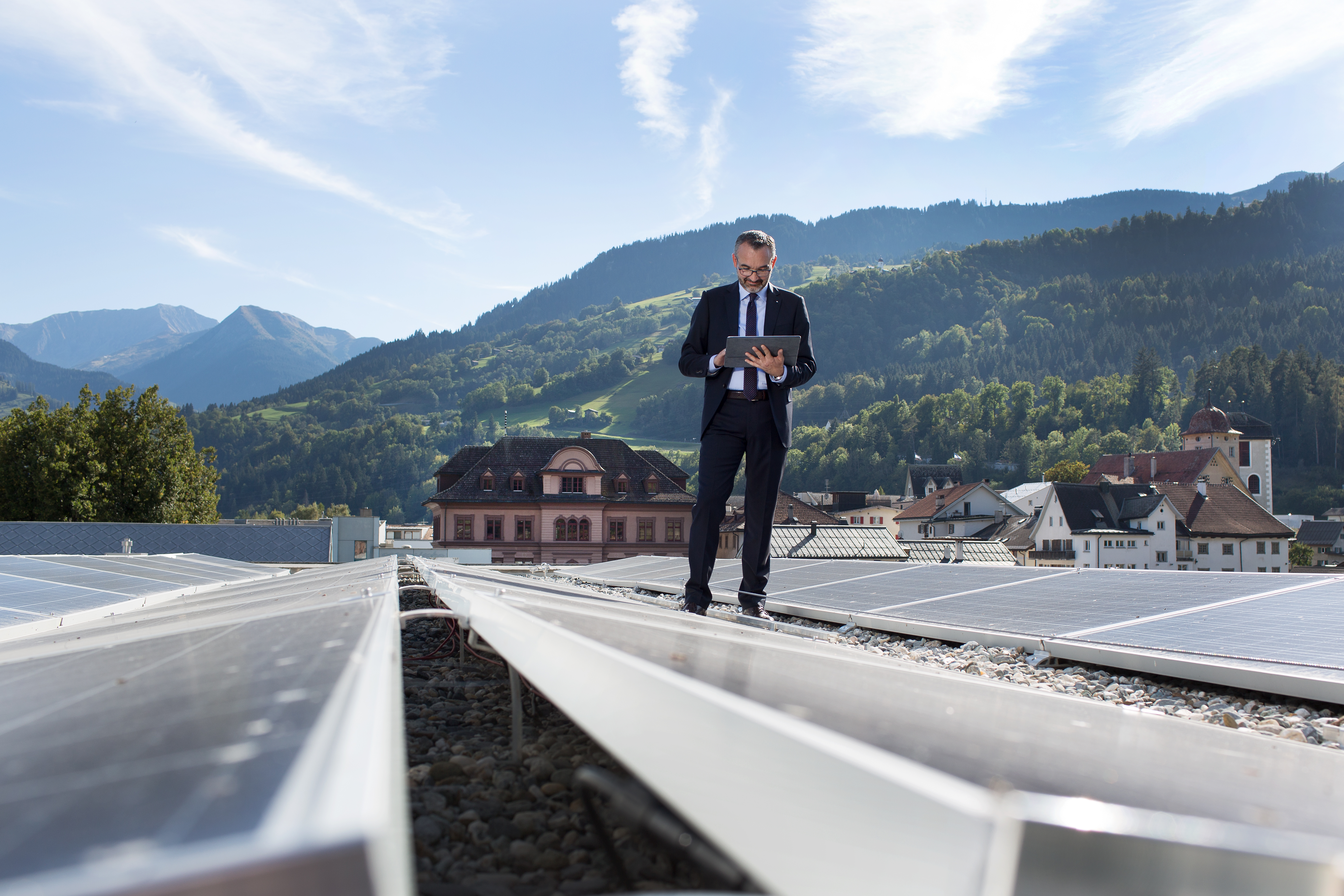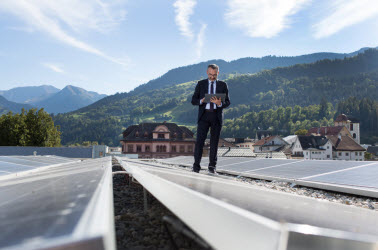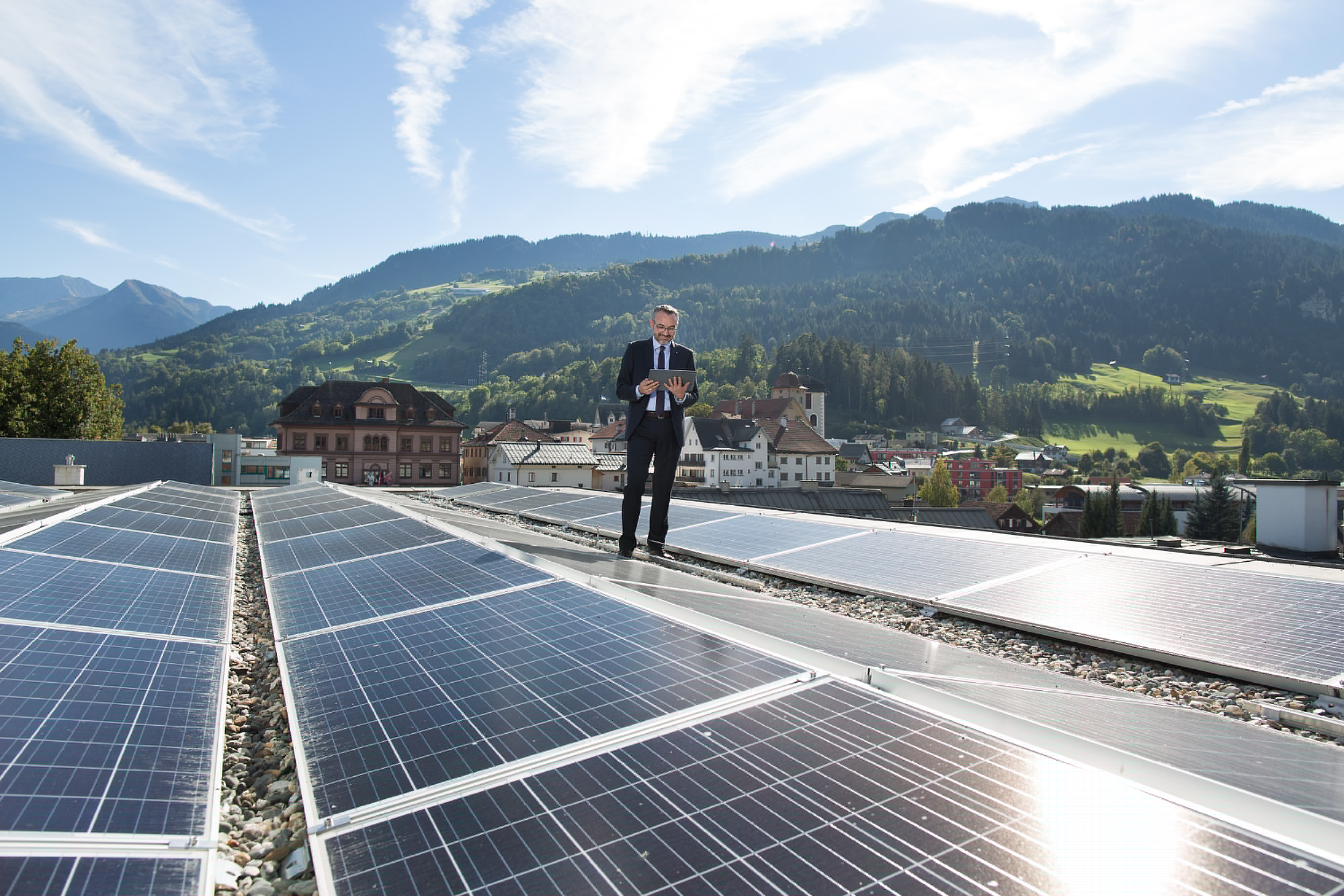 Christian Alig auf dem Dach der GKB Ilanz: der mit Sonnenenergie gewonnene Strom wird für den Betrieb der Bank verwendet.
