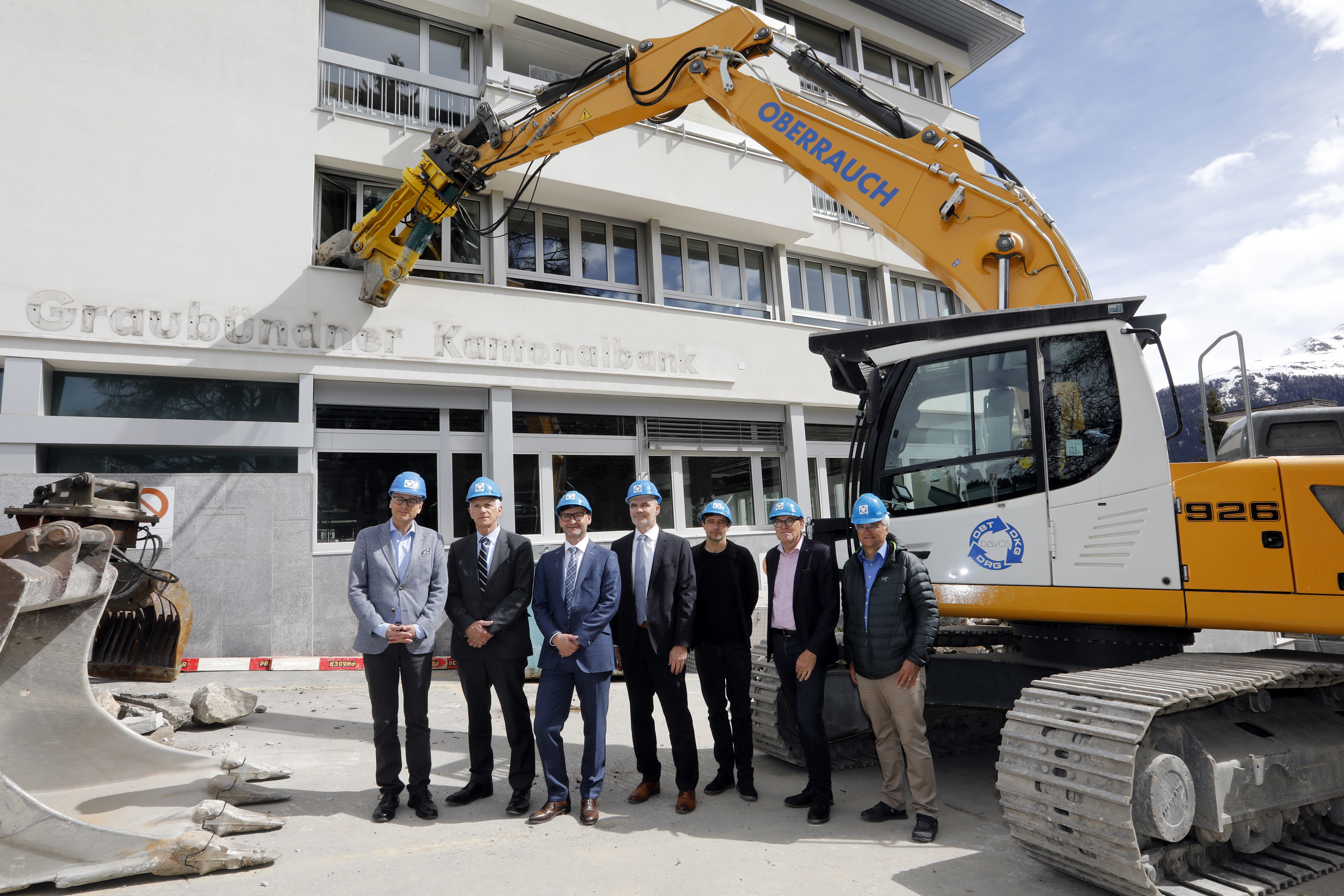 Als Investorin und Bauherrin eröffnete die Graubündner Kantonalbank mit dem Spatenstich vom 24. April 2019 feierlich die Baustelle zum Neubau ihres Regionalsitzes in Davos Platz. Tarzisius Caviezel, Landammann Gemeinde Davos, Urs Meng, Architekt und Projektleiter von D. Jüngling und A. Hagmann, Enrico Lardelli, Leiter IT/Operations und Mitglied der GKB Geschäftsleitung, sowie Christian Meuli, Leiter der GKB Region Davos Klosters, informierten dabei über das Bauvorhaben, dessen Wichtigkeit für die Region Davos und die Zusammenarbeit mit allen Partnern.