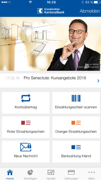 Zusätzlich wurde die Startseite der App komplett überarbeitet und übersichtlicher gestaltet. Die wichtigsten Funktionen lassen sich jetzt nach individuellen Bedürfnissen anordnen und schneller aufrufen. Als weiteren Service in die GKB Mobile Banking App integriert sind verschiedene Publikationen zum Kanton Graubünden und zur GKB. Dazu gehören die Statistikbroschüre «Graubünden in Zahlen», der GKB Geschäftsbericht sowie die Flyer zu den Jahres- und Halbjahreszahlen.