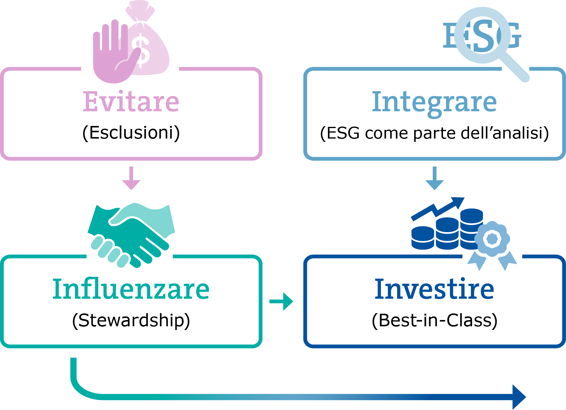 L’integrazione sistematica di questi aspetti nel processo di analisi e d’investimento può contribuire a riconoscere tempestivamente i rischi, a considerare nuove opportunità commerciali e a sostenere il profilo di rischio/rendimento a lungo termine dei portafogli.