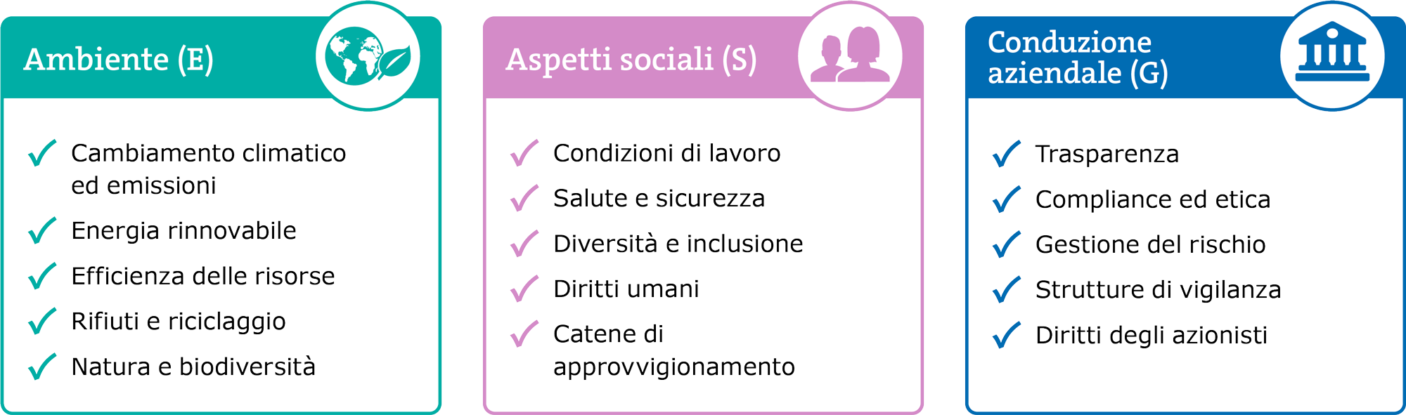 Fattori ambientali come il cambiamento climatico, aspetti sociali come le condizioni di lavoro e questioni di governance come la trasparenza e la conduzione etica dell’impresa sono decisivi.