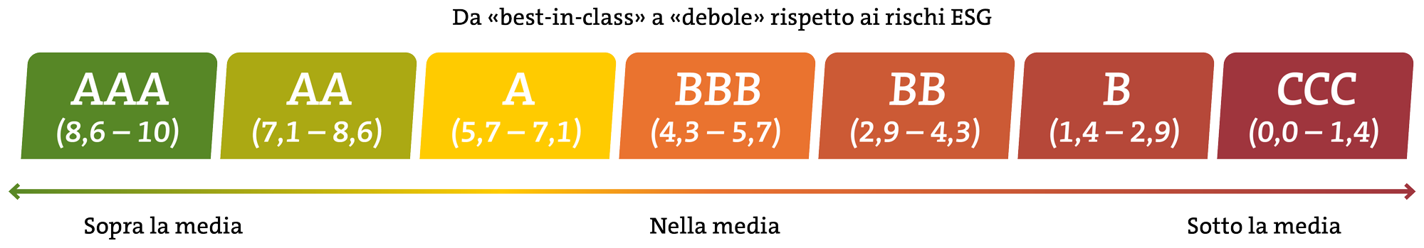 La classificazione avviene su una scala da «AAA» a «CCC», basata sull’esposizione ai rischi ESG e sulla qualità di gestione di tali rischi rispetto ai peer rilevanti. Il rating ESG si basa su un punteggio ESG sottostante ricavato dalla valutazione di singoli indicatori e temi ESG.