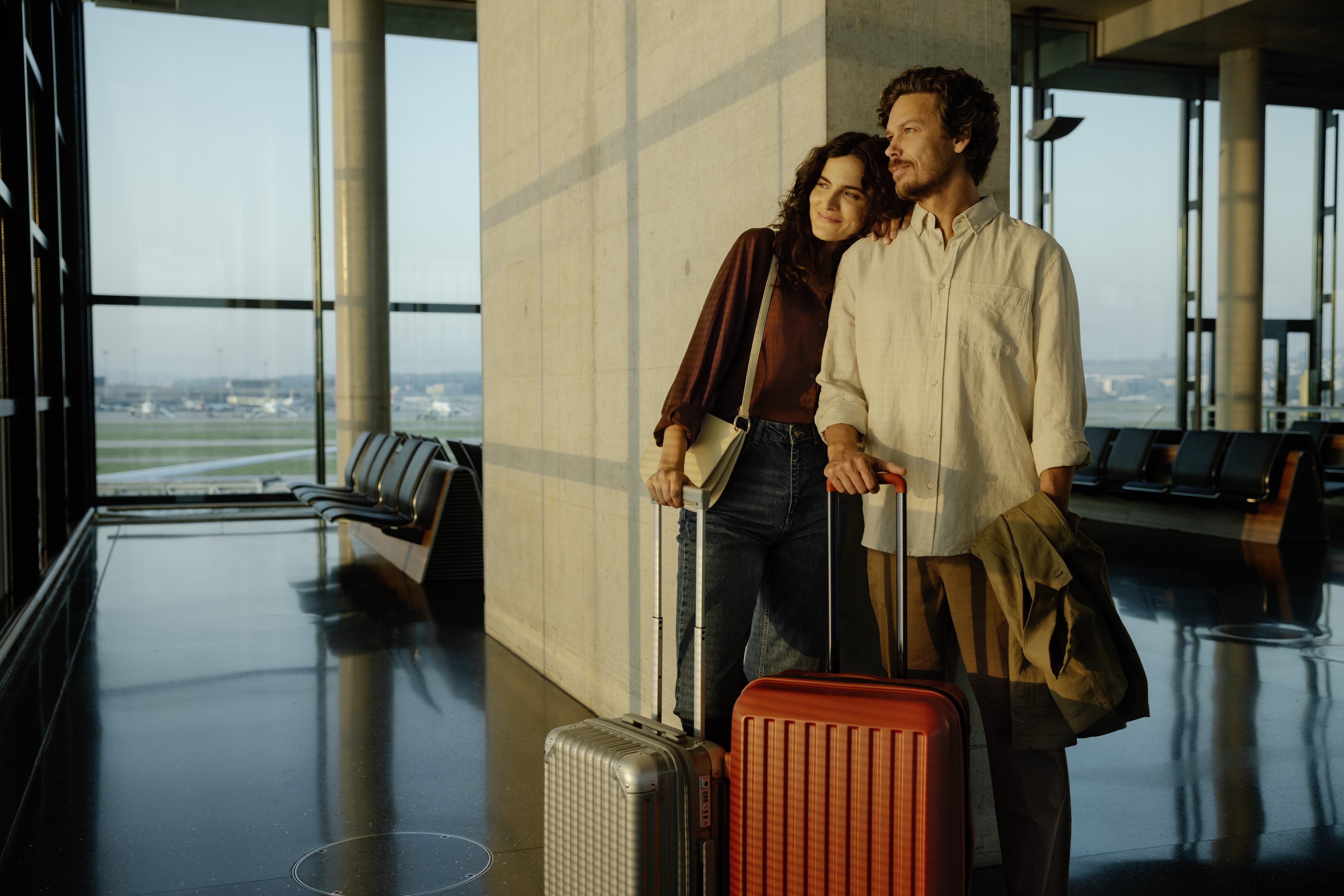 Una coppia è in piedi all’aeroporto con le valigie.