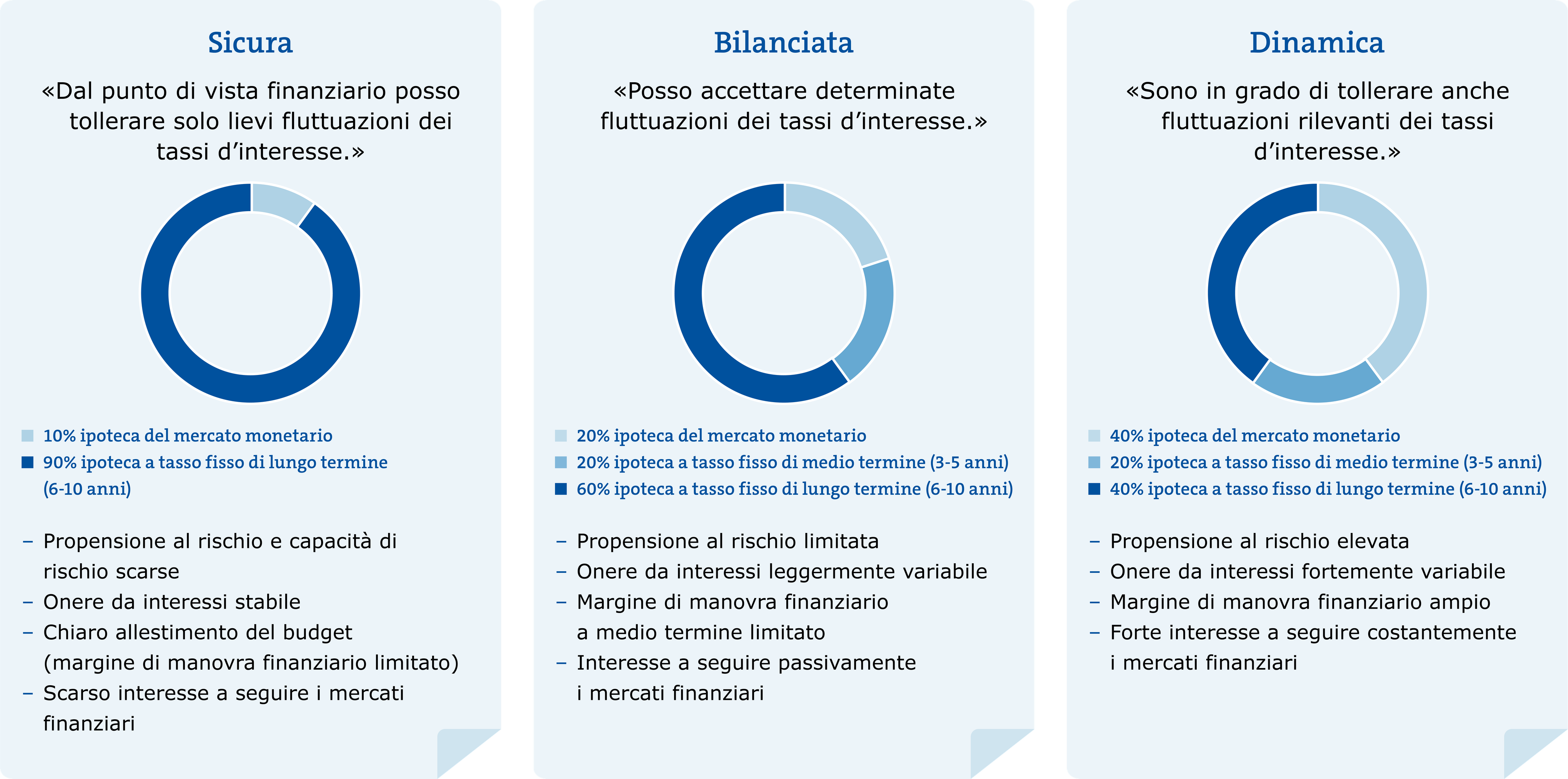 Strategia dinamica: il vostro margine di manovra finanziario è in grado di tollerare anche oscillazioni dei tassi di interesse più consistenti. Con una maggiore propensione al rischio e un monitoraggio attivo del mercato dei capitali crescono le vostre possibilità finanziarie.