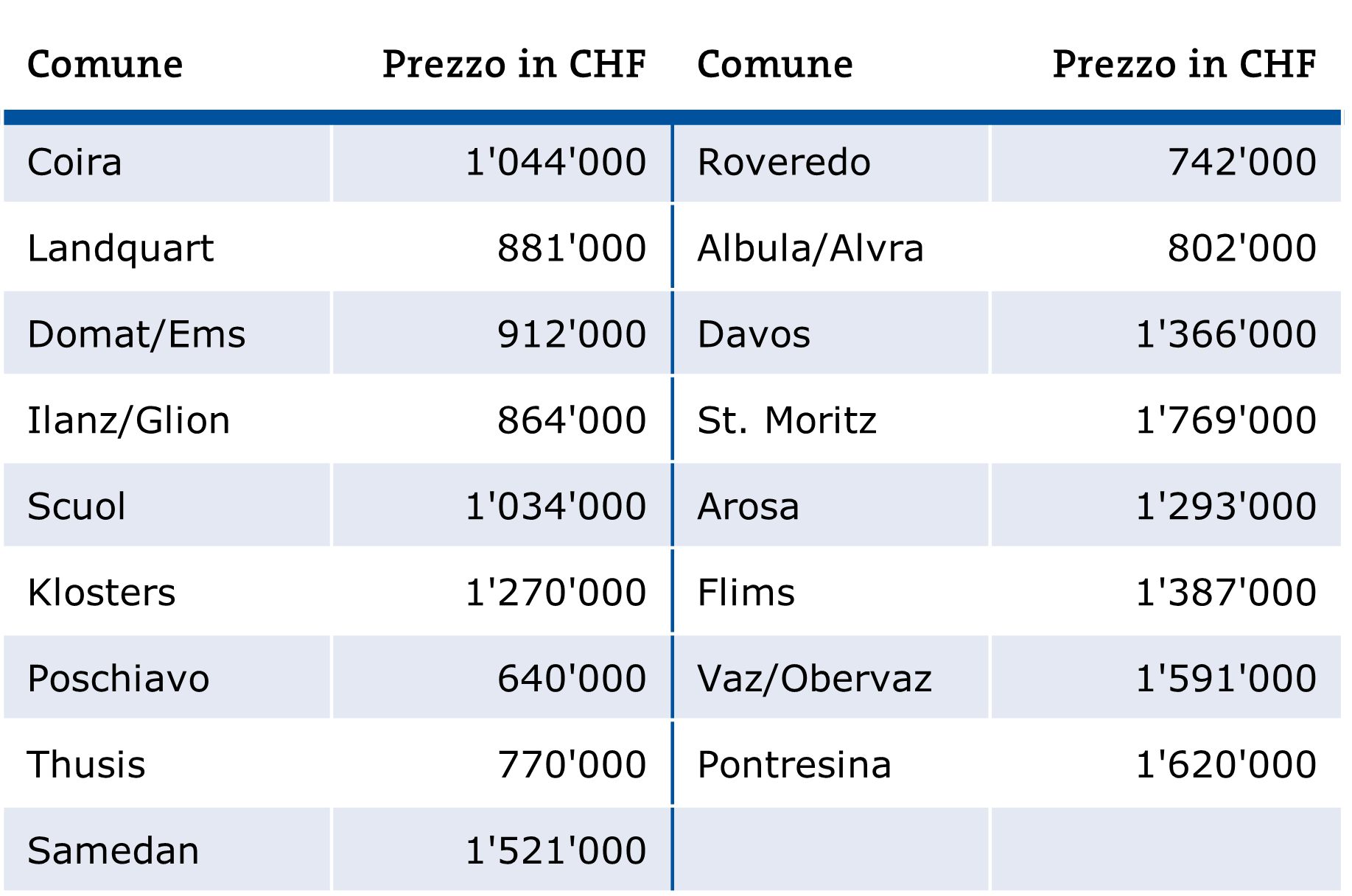 Il prezzo medio di una tipica casa unifamiliare utilizzata come abitazione primaria di circa 140 m² di superficie abitabile e 600 m² di terreno è attualmente di oltre CHF 1,3 milioni. Questo livello di prezzo corrisponde più o meno a quello pagato a Landquart. A Coira, Klosters o Davos un oggetto simile costa tra CHF 1,7 e CHF 1,8 milioni, mentre nelle ubicazioni più richieste i prezzi possono superare nettamente i CHF 2 milioni.