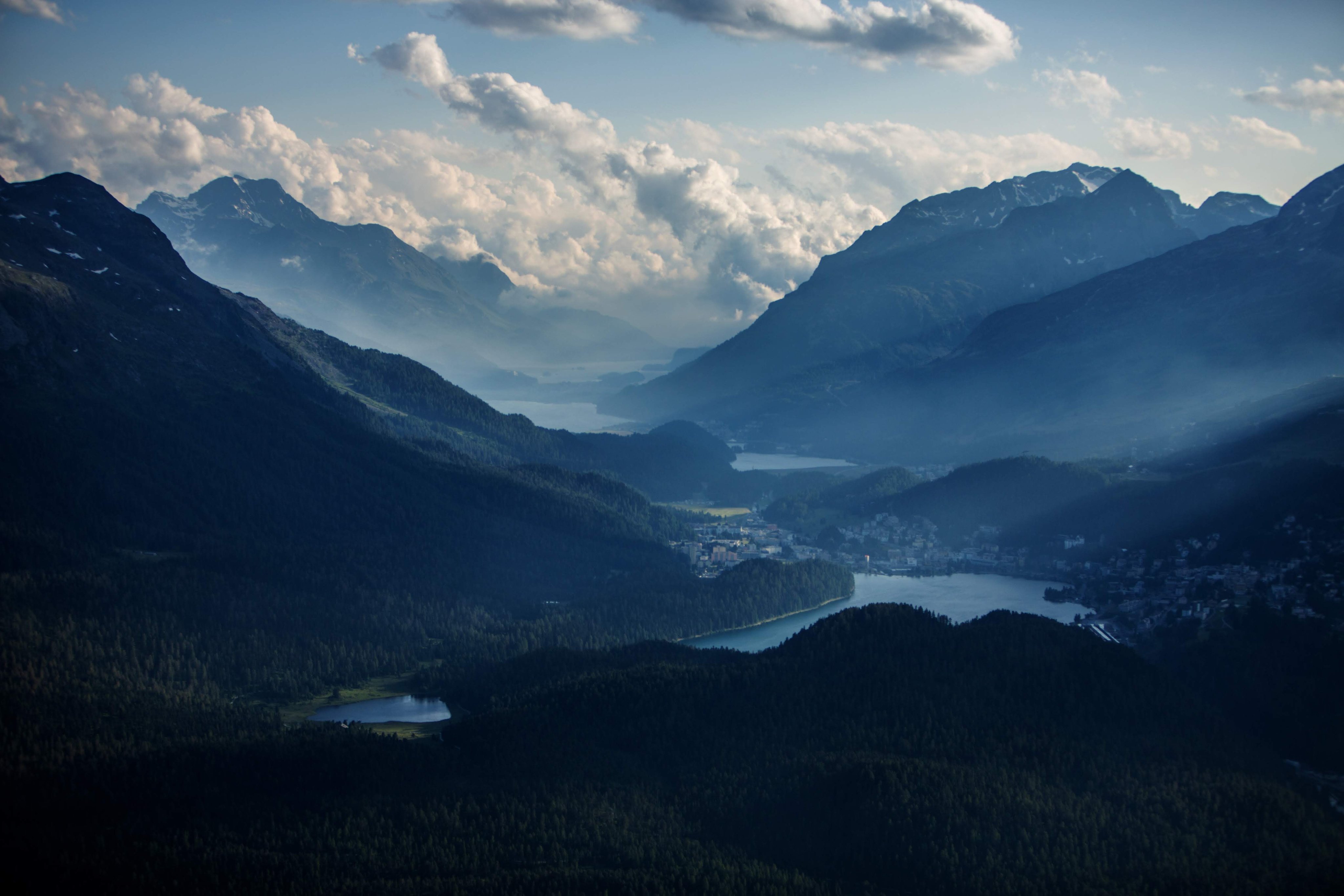 Vista sull’Engadina con paesaggio montano, laghi e città.