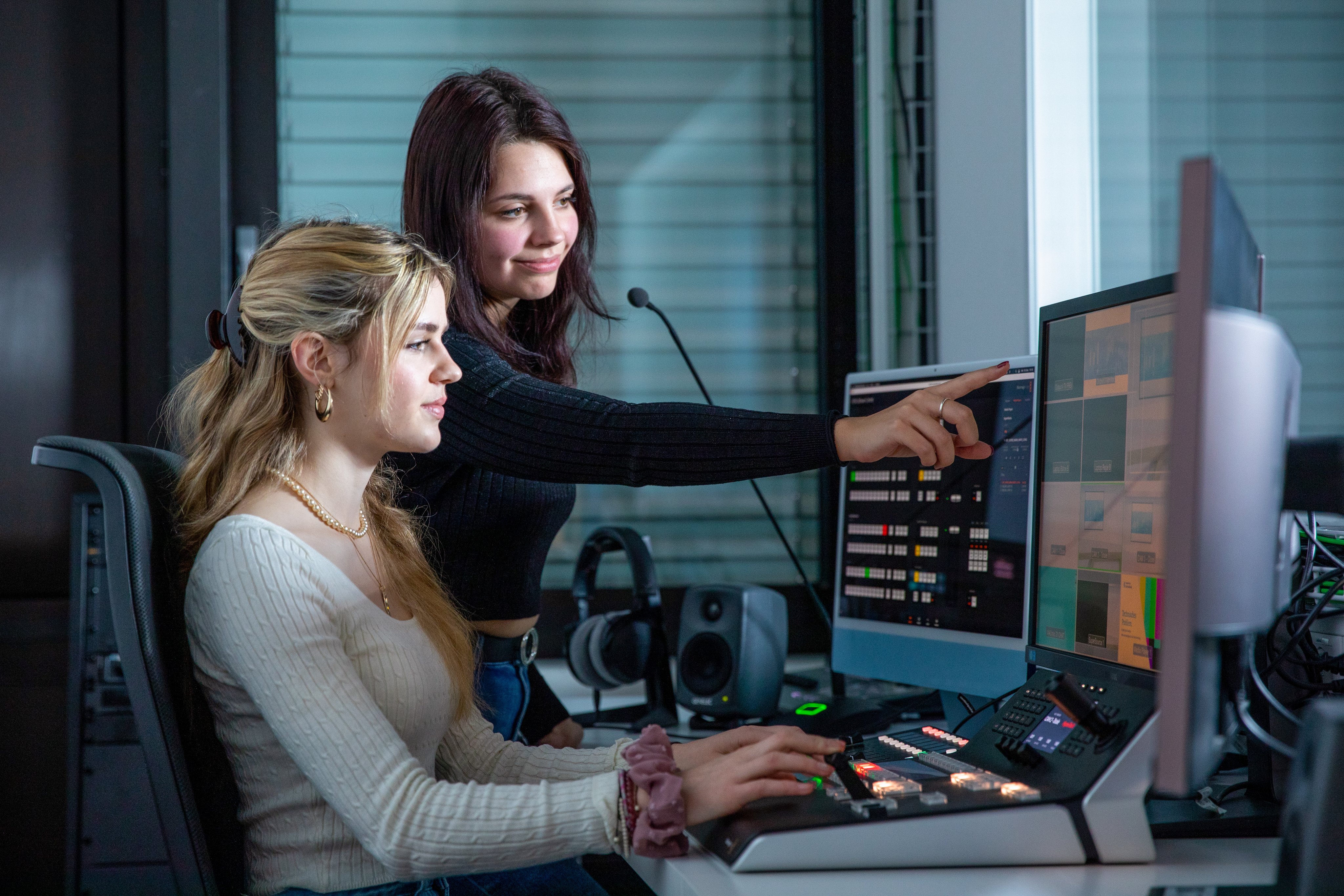 Due mediamatiche in studio davanti allo schermo. La persona in formazione indica lo schermo.