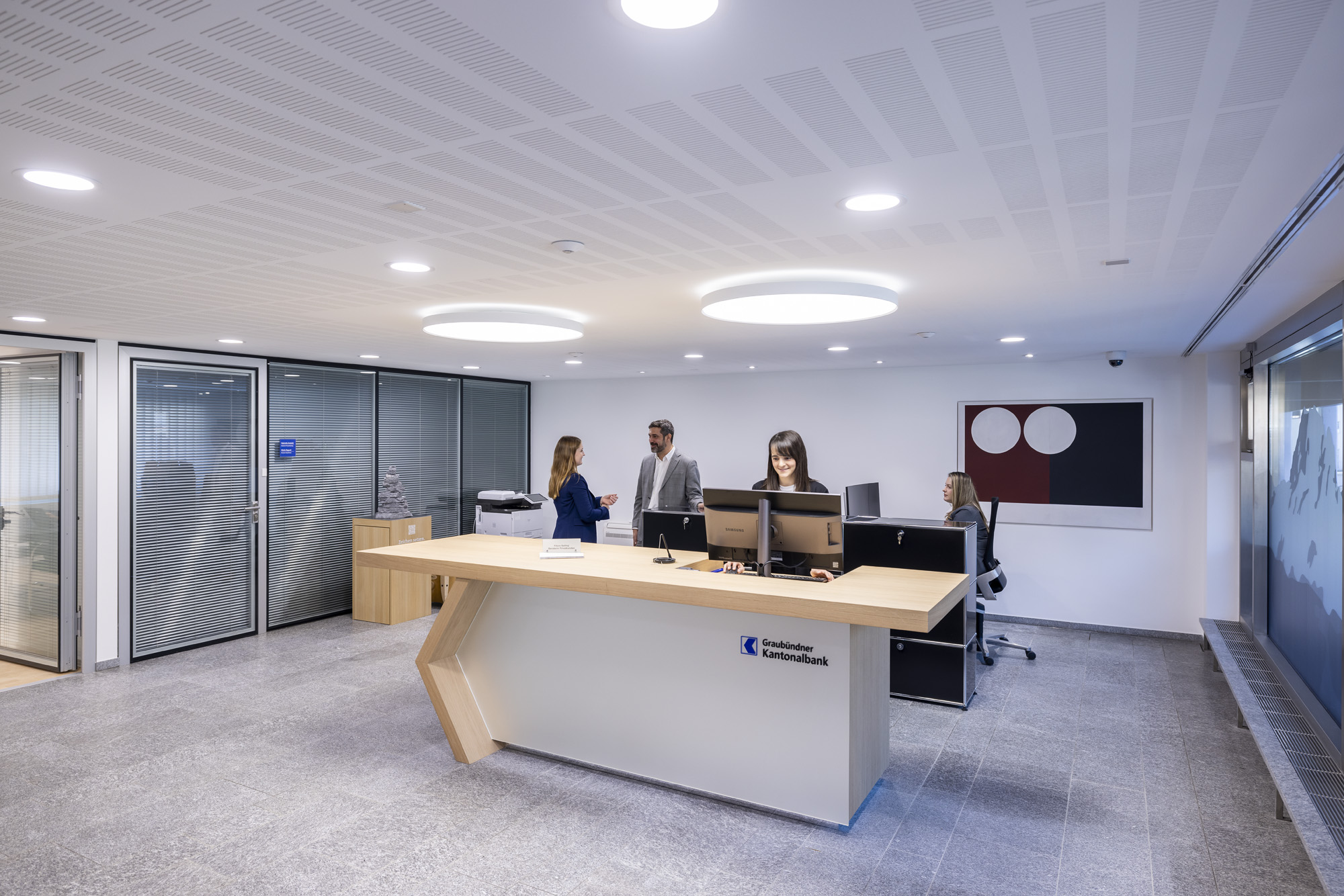 La BCG Schiers non ha più i tradizionali sportelli. La novità è rappresentata dal desk della reception, a disposizione per informazioni generali, per esempio sulle carte o sui prodotti semplici. Le consulenze si tengono direttamente nelle sale riunioni. In tal modo la BCG può affermarsi come moderna banca di consulenza. «Con queste innovazioni, il nostro team di consulenti può concentrarsi ancora di più sull’assistenza individuale», spiega con soddisfazione Diego Senti, responsabile regione Landquart. Inoltre è importante sottolineare come la BCG possa in questo modo continuare a offrire interessanti posti di lavoro nella regione.